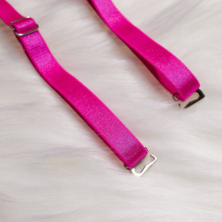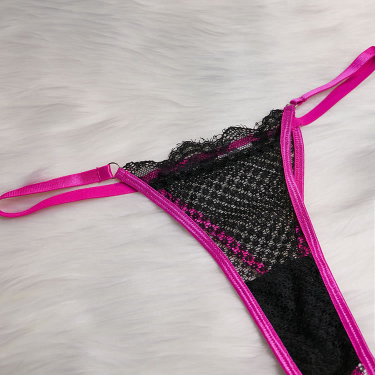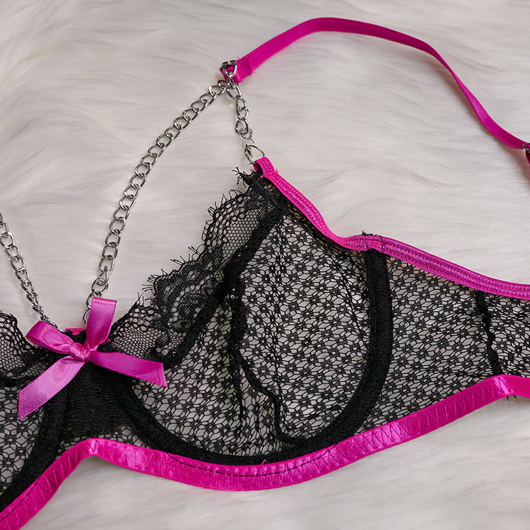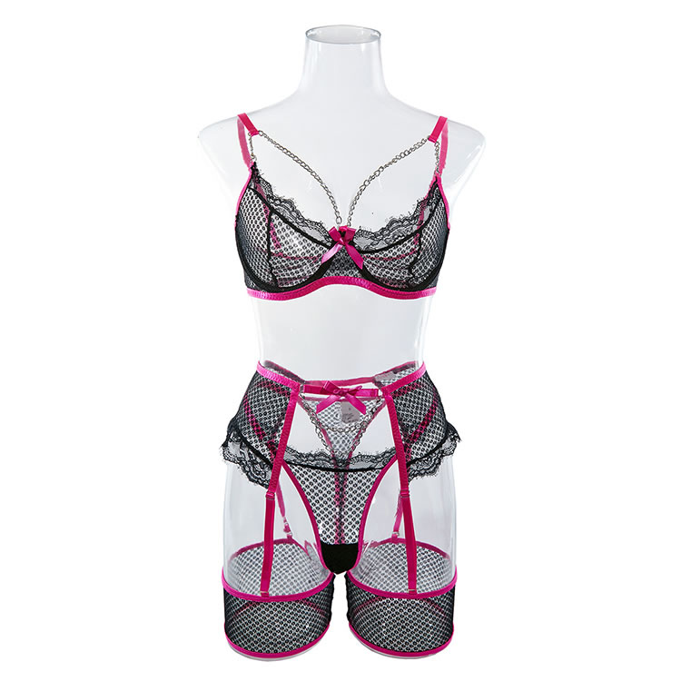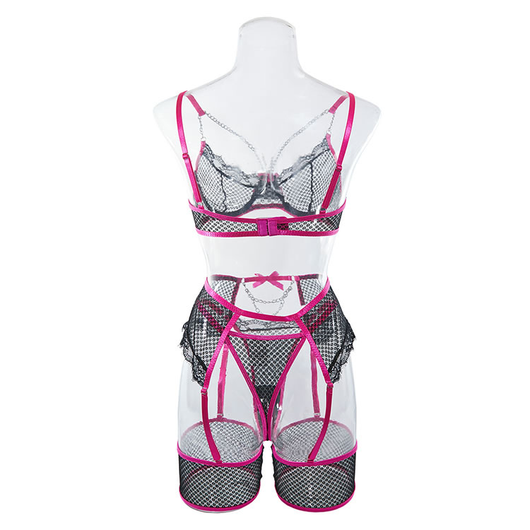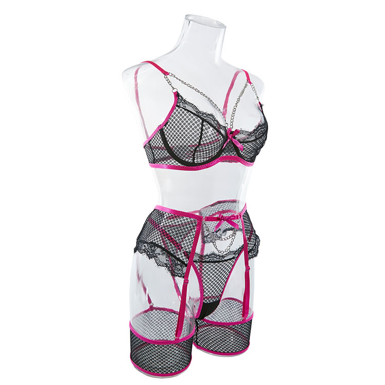 Get lost in an enticing daydream in this ethereal, exclusive bra set featuring sheer lace underwire cups with a chain detail, adjustable spaghetti straps, a hook and eye back closures, a matching garter belt with adjustable garter straps, wraparound leg garters, and a matching panty with a thong cut back.
