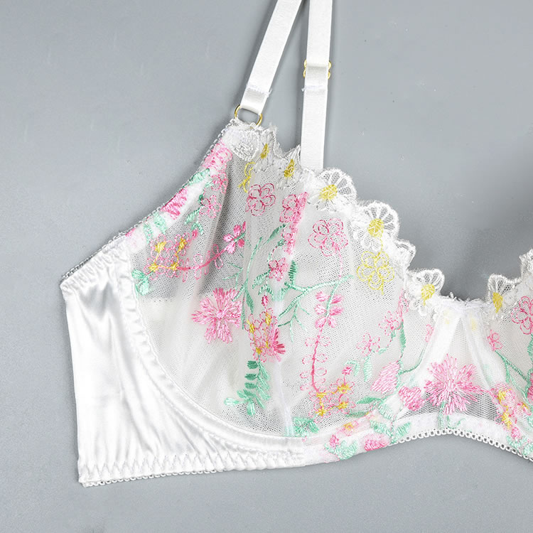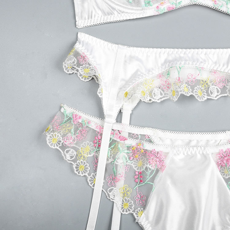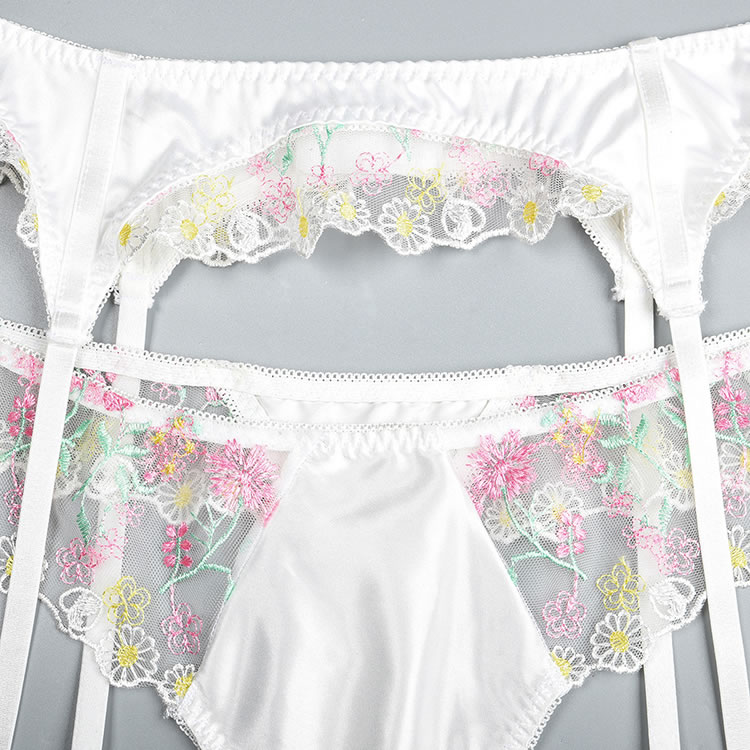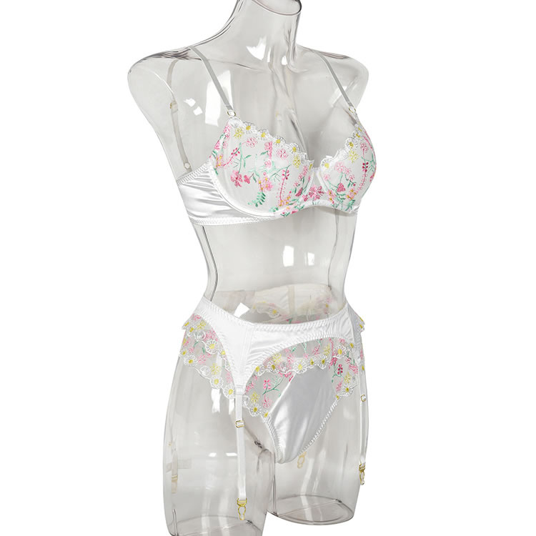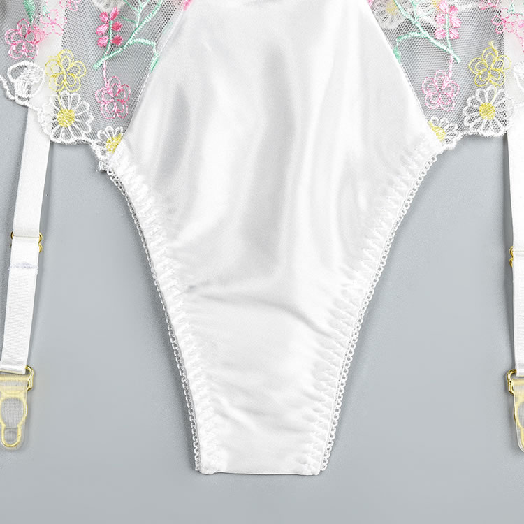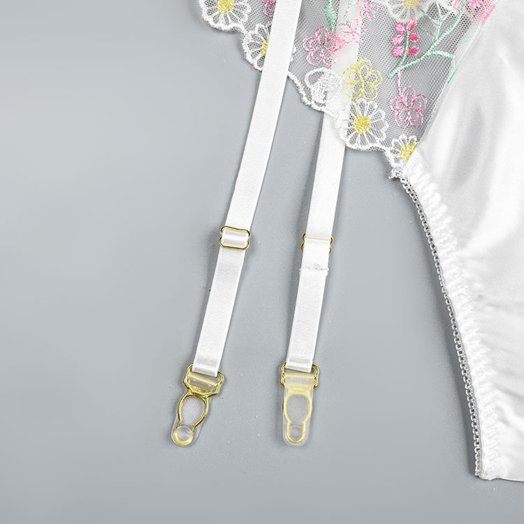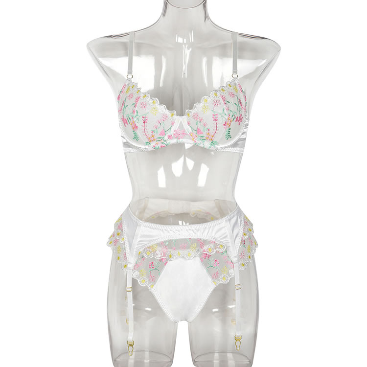Add a touch of allure to your intimate collection with this stunning ensemble! Embrace the charm of this playful bra set, adorned with underwire cups delicately embroidered with floral patterns. The adjustable spaghetti straps ensure a personalized fit, while the hook-and-eye back closure adds a hint of seduction. Complete the look with the coordinating garter belt, featuring a matching hook-and-eye back closure and adjustable garter straps. This set is crowned with a matching thong panty, making it an essential addition to your boudoir.