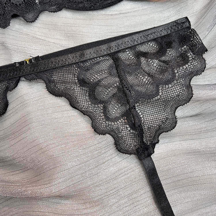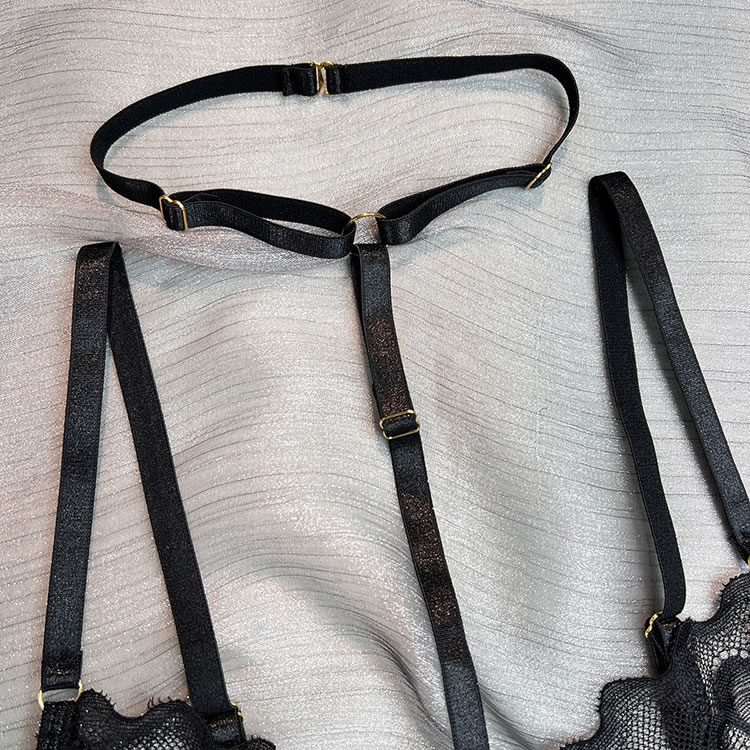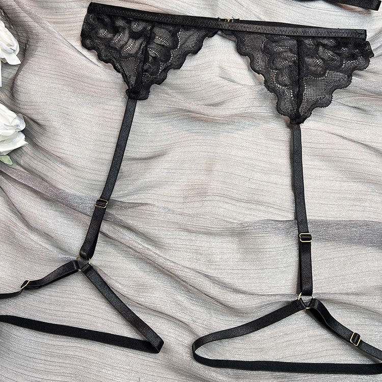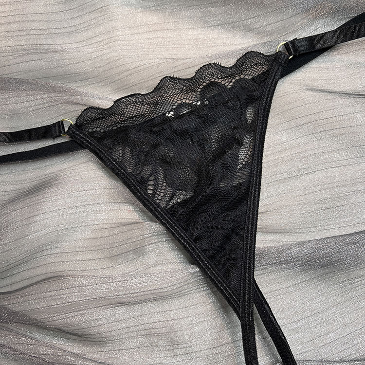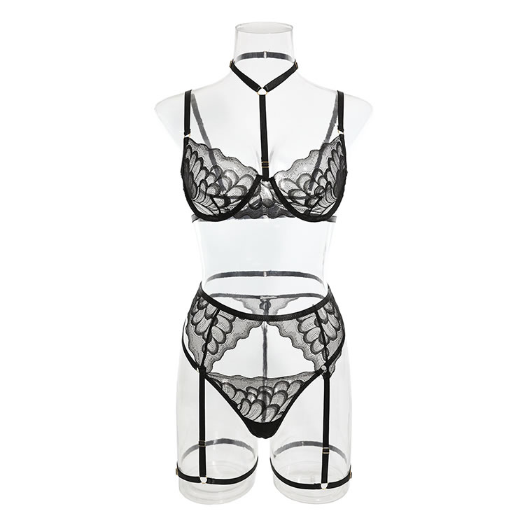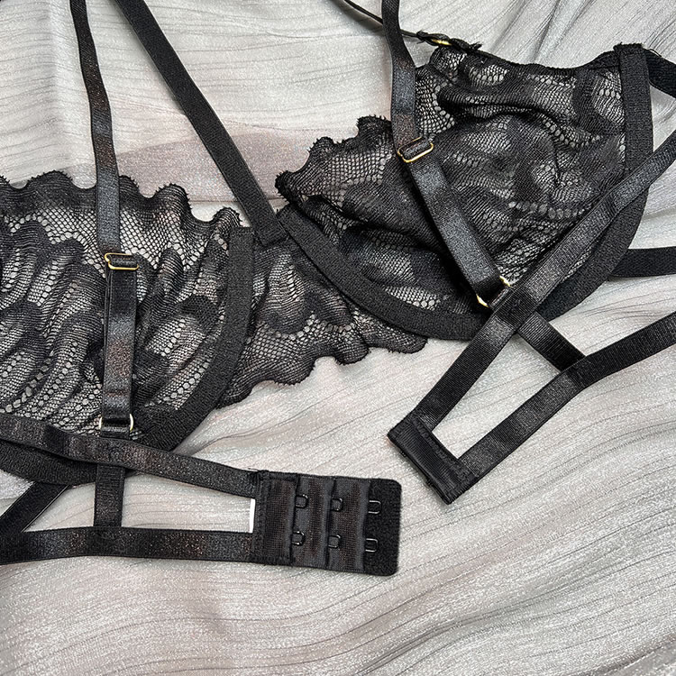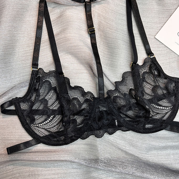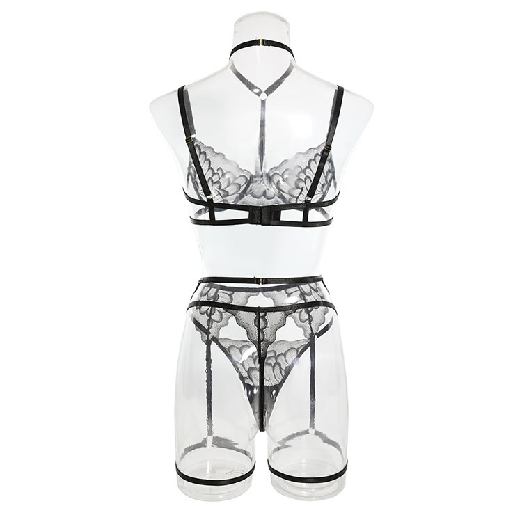 Feel like a sexy seductress in this black bra set featuring sheer lace cups with underwire, a choker harness, adjustable spaghetti straps, a hook and eye back closure, a matching high waisted garter belt with a hook back closure, adjustable garter straps with wraparound leg garters, and a matching panty with a thong cut back.