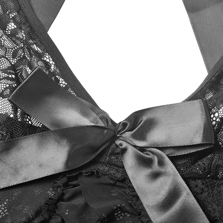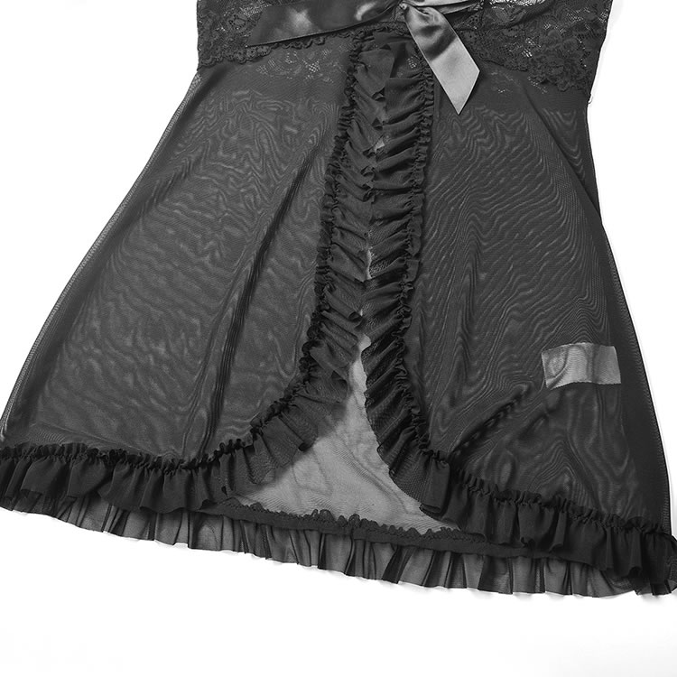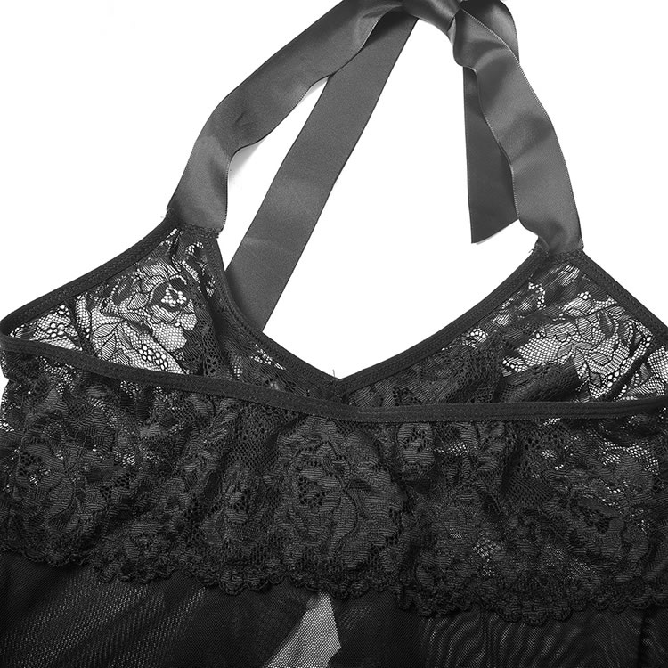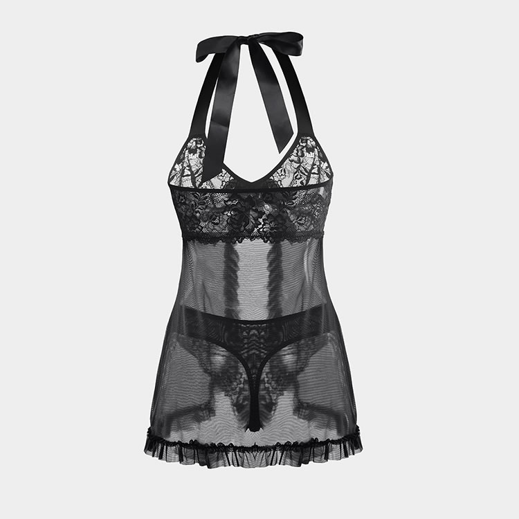 Indulge in the seductive allure of this black lace and mesh babydoll set. The halter neck design with a bow accent adds a touch of elegance, while the sheer mesh panels and intricate lace detailing create a captivating look. The adjustable straps ensure a comfortable fit, and the matching thong completes the ensemble, making it perfect for both intimate moments and special occasions.