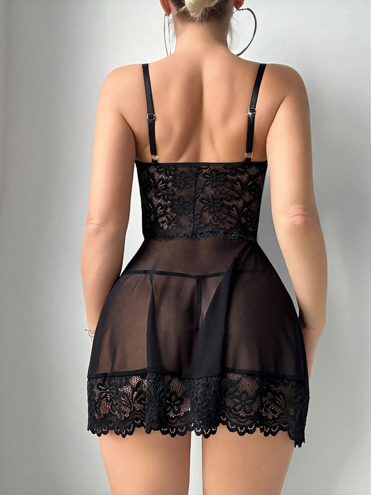This seductive black lace chemise is perfect for those who love a blend of boldness and femininity. The bodice features intricate floral lace patterns that add a touch of elegance, while the pink bows on the straps introduce a playful contrast. The sheer skirt enhances its allure, making it an ideal choice for anyone seeking a confident and charming look.