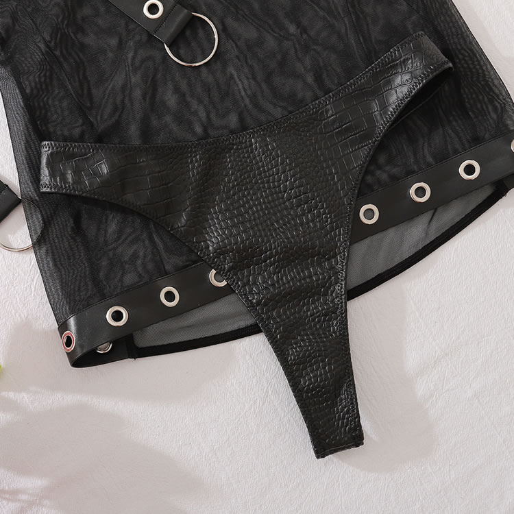Indulge in the seductive allure of this black leather and mesh lingerie set. The bra features a unique design with eyelets and silver rings, providing a blend of edgy and elegant styles. The sheer mesh sleeves and skirt add a touch of mystery and allure, while the halter straps ensure a comfortable fit. Perfect for both intimate moments and special occasions, this set is designed to accentuate your natural curves.
