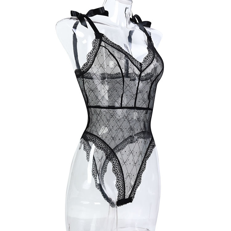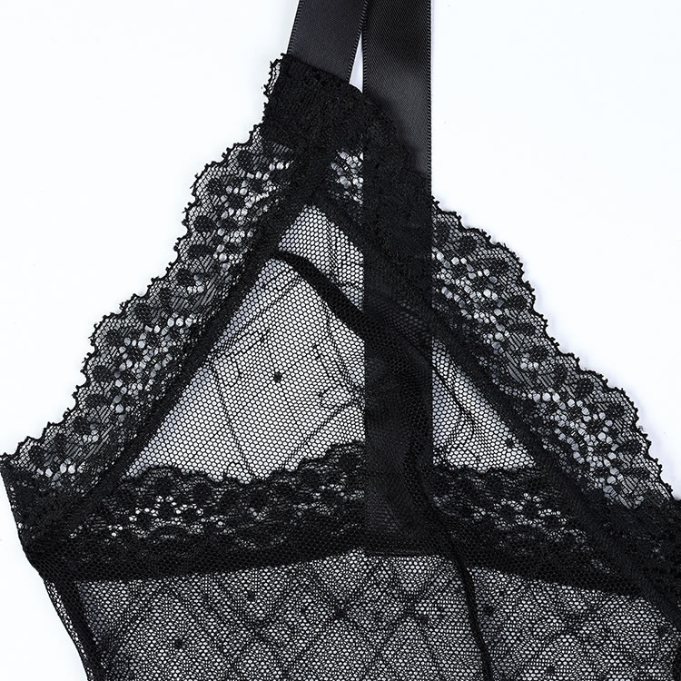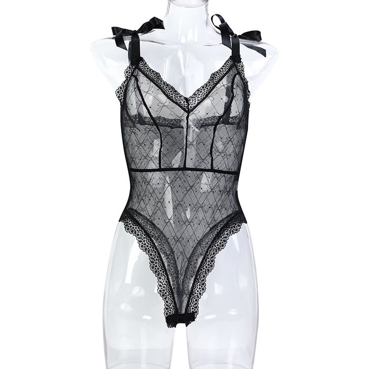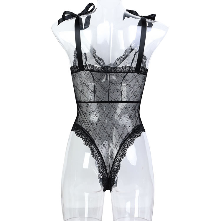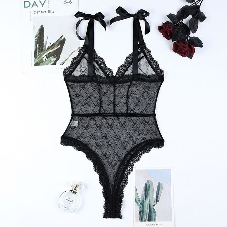 This alluring black sheer bodysuit features delicate lace trim that adds a touch of elegance and charm. The intricate design and flattering fit create a captivating silhouette, while the adjustable straps ensure comfort and ease. Perfect for those who want to feel confident and irresistible in their intimate moments.