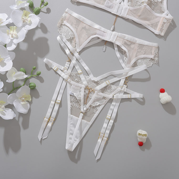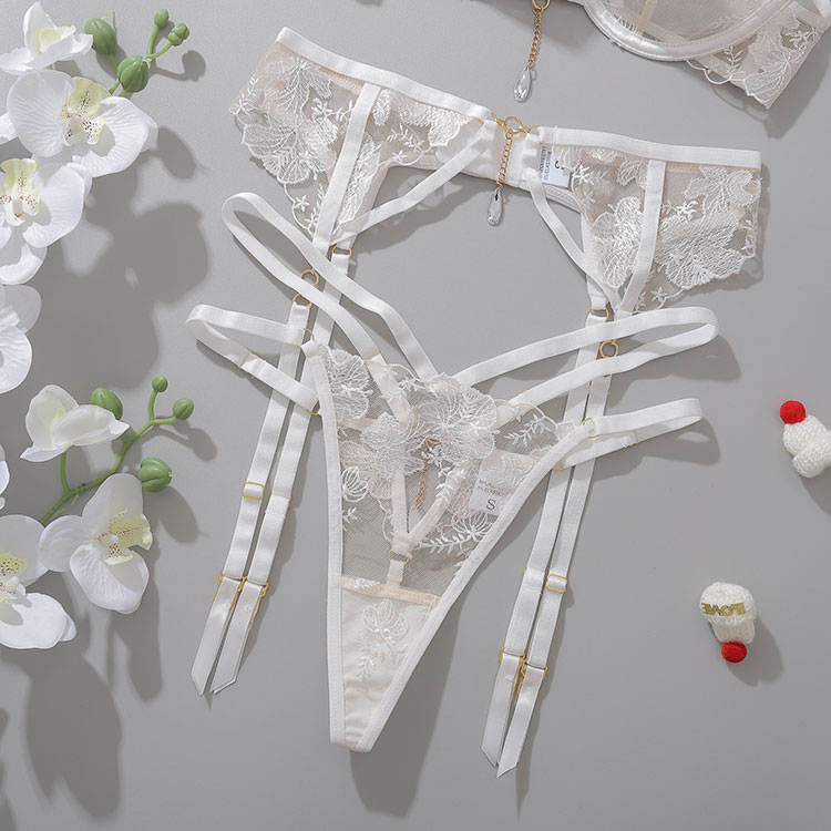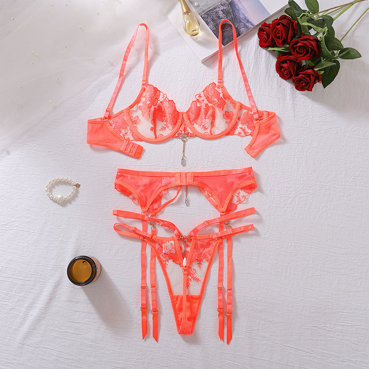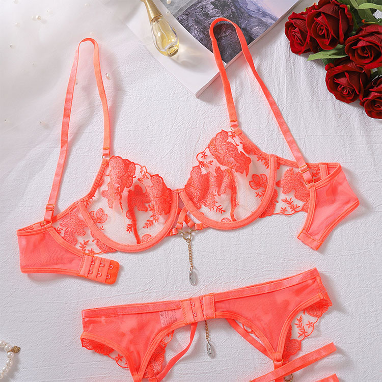This seductive lingerie set features a deep V-neck bra with intricate lace detailing and sheer mesh inserts, paired with high-waisted bottoms that include crisscross straps and garter attachments. The combination of vibrant colors and delicate lace adds a touch of daring elegance.