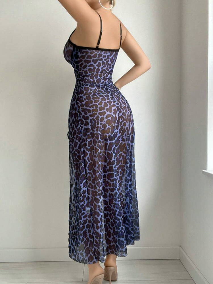 Indulge in charm and elegance with this lingerie set. The bra showcases a leopard print design with black lace trim, while the sheer fabric and high-slit sides add a touch of allure. Perfect for those who appreciate both style and comfort.