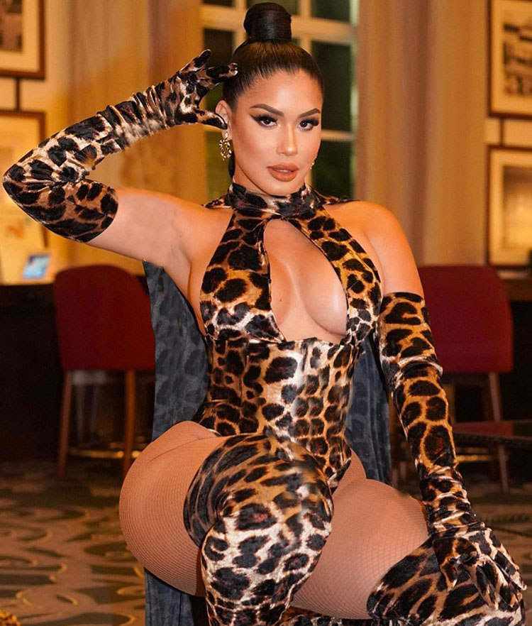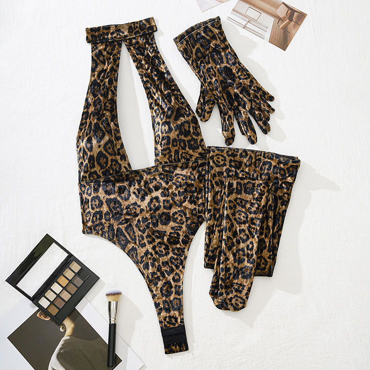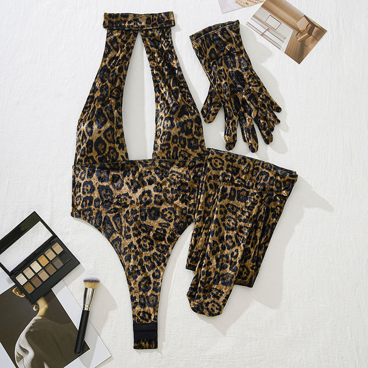 This seductive lingerie set features a high-cut bodysuit with intricate leopard print detailing, paired with matching gloves and thigh-high stockings. The combination of bold leopard print and cut-out adds a touch of daring elegance.