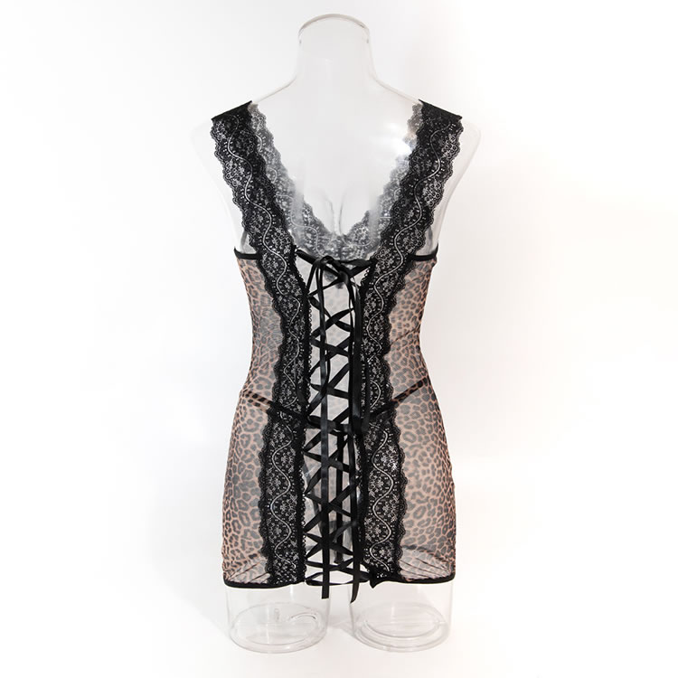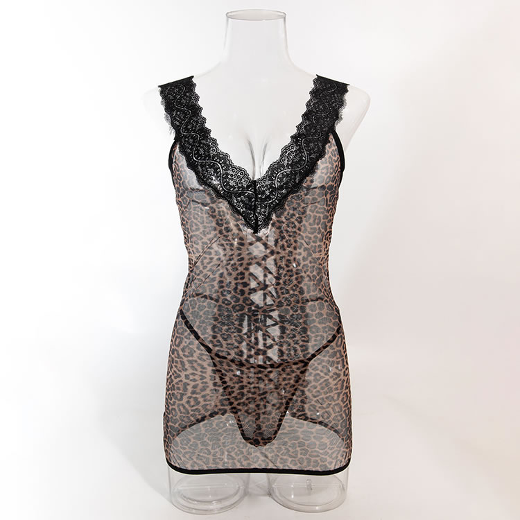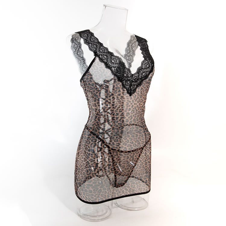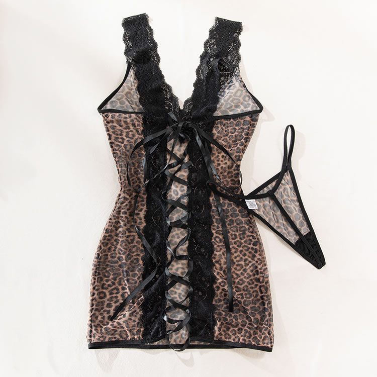 This seductive leopard print sheer babydoll is a bold choice for those who love to make a statement. The intricate lace detailing at the neckline adds a touch of elegance, while the sheer fabric with a striking animal print creates a captivating silhouette. Perfect for adding a wild and alluring vibe to your lingerie collection.