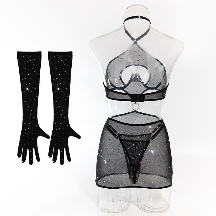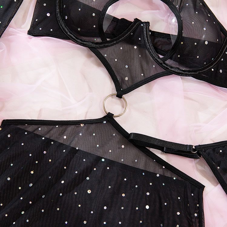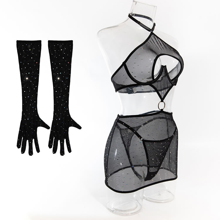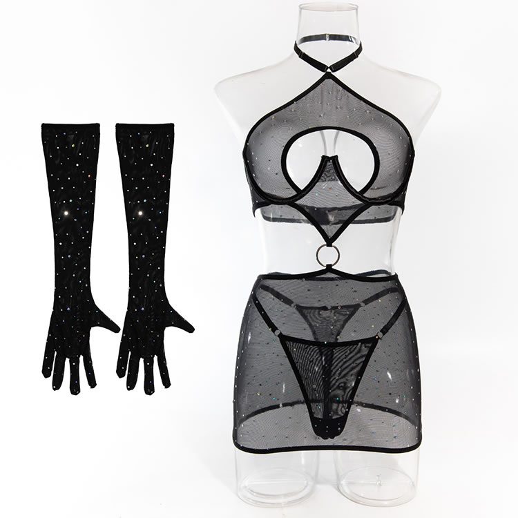 Elevate your look with this seductive mesh lingerie set that offers heart-shaped cut-outs for added flair. The sheer fabric and sparkling embellishments provide a unique and eye-catching design. This piece is versatile and can be worn as a statement item or layered under other garments for a chic appearance.