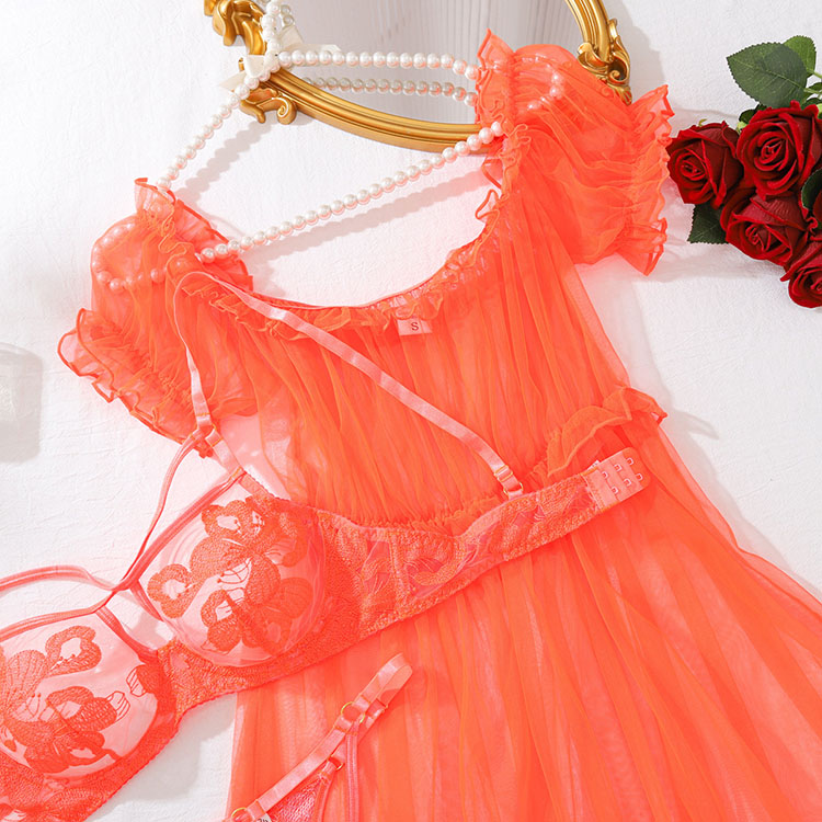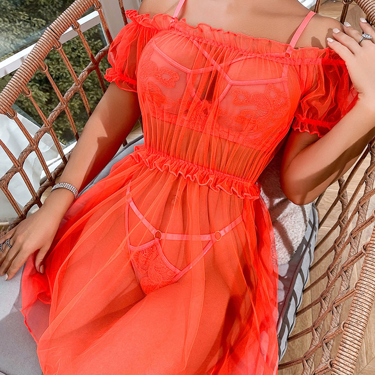 This stunning lingerie set features an off-the-shoulder design with sheer fabric and intricate embroidery. The ruffled neckline adds a touch of elegance, while the fitted waistband enhances your silhouette.