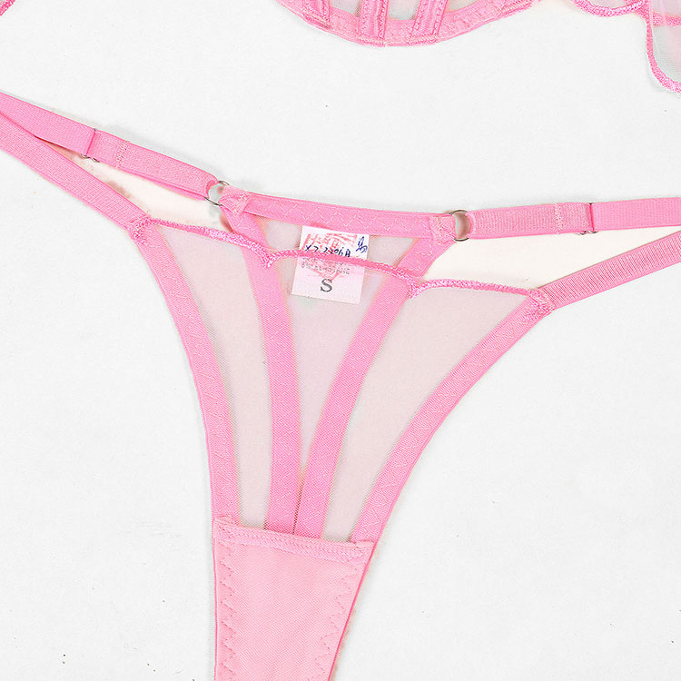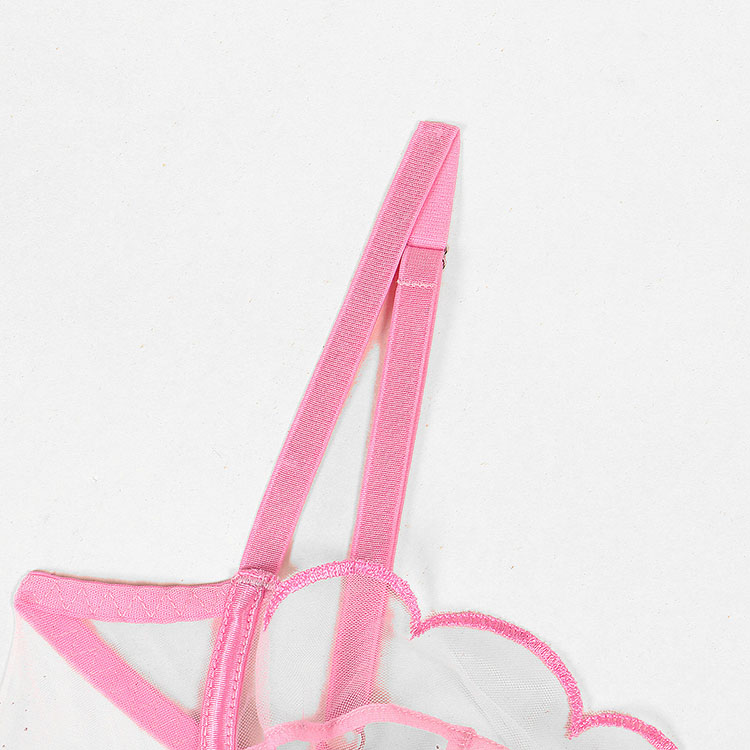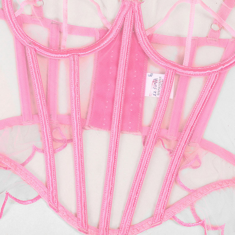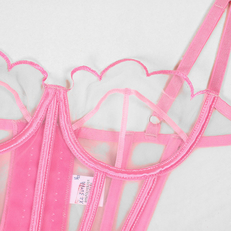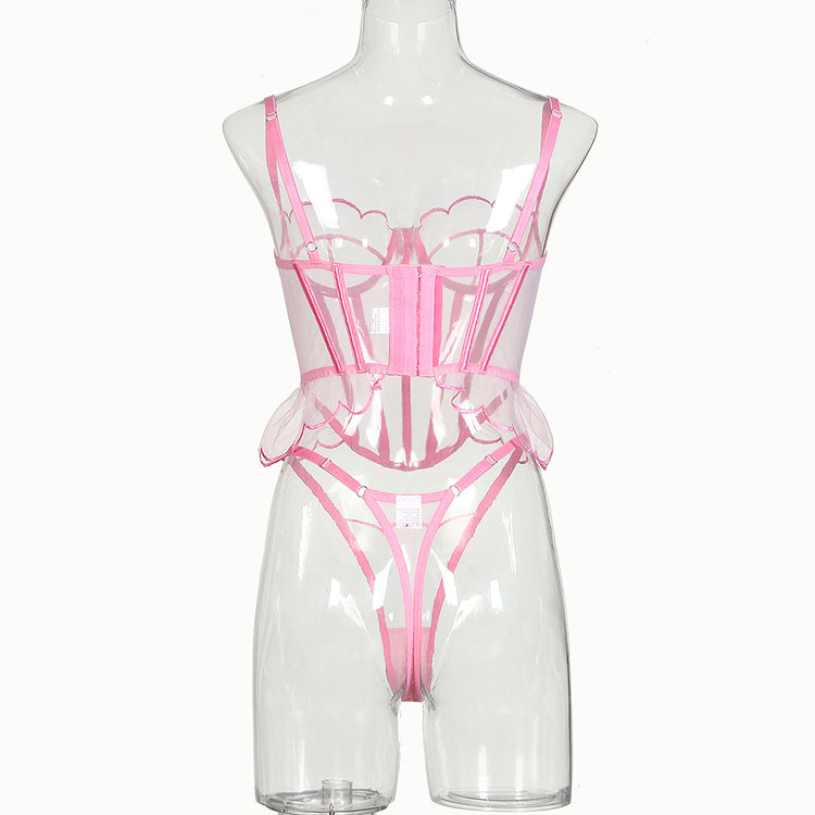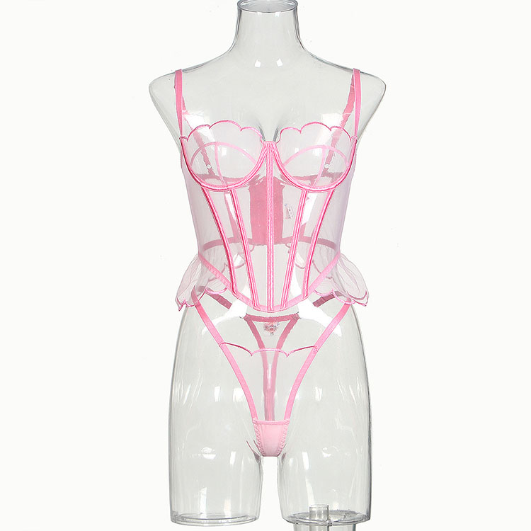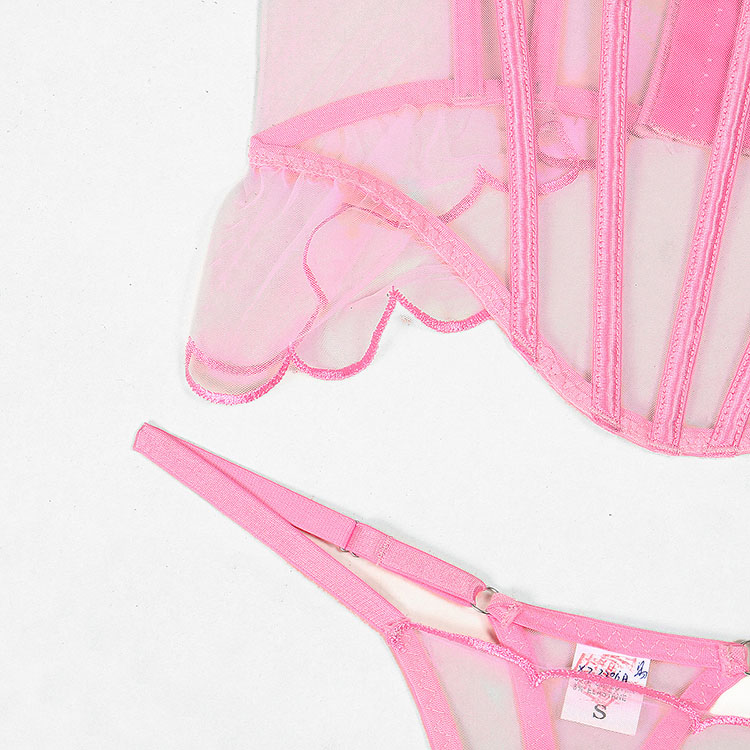 This seductive lingerie set features a pink sheer corset-style bra with scalloped edges and vertical boning for a structured fit. The matching thong is designed with the same sheer fabric and scalloped trim, offering a cohesive and alluring look.