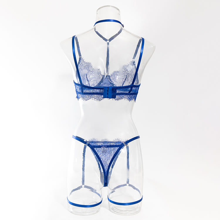 Indulge in the seductive allure of this royal blue lace lingerie set. The bra features intricate lace detailing and sheer mesh panels that provide a blend of elegance and allure. The underwire cups offer support and shape, while the adjustable straps ensure a comfortable fit. The matching thong complements the set with its delicate lace trim and center seam, making it perfect for both intimate moments and special occasions.