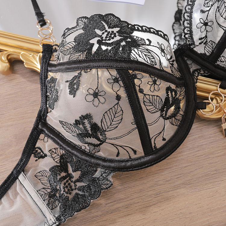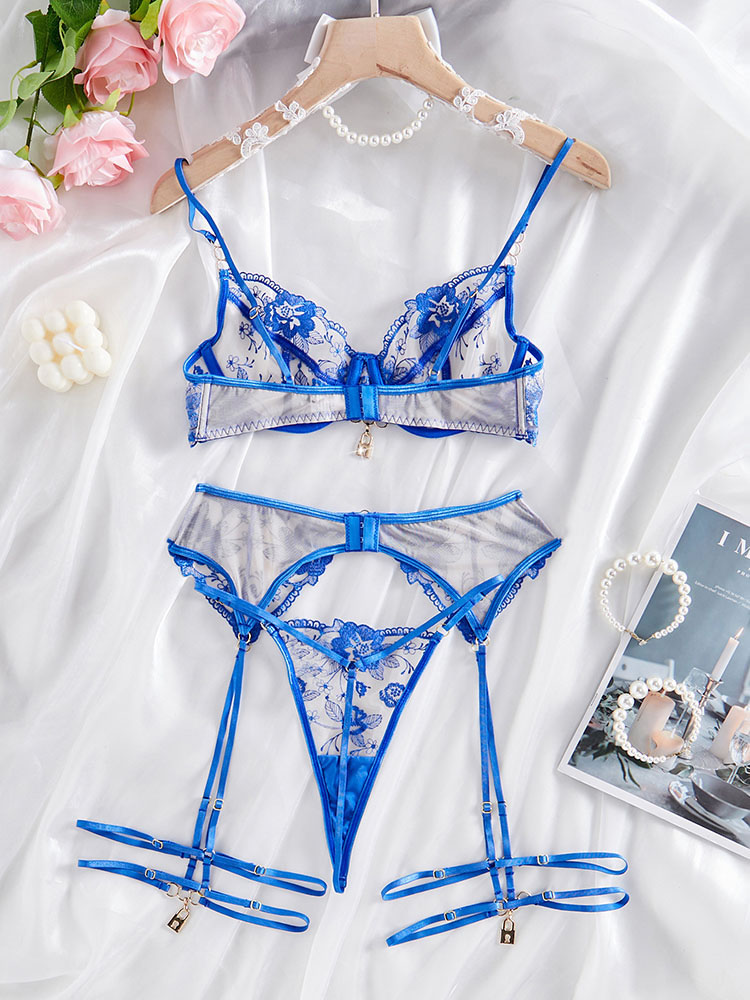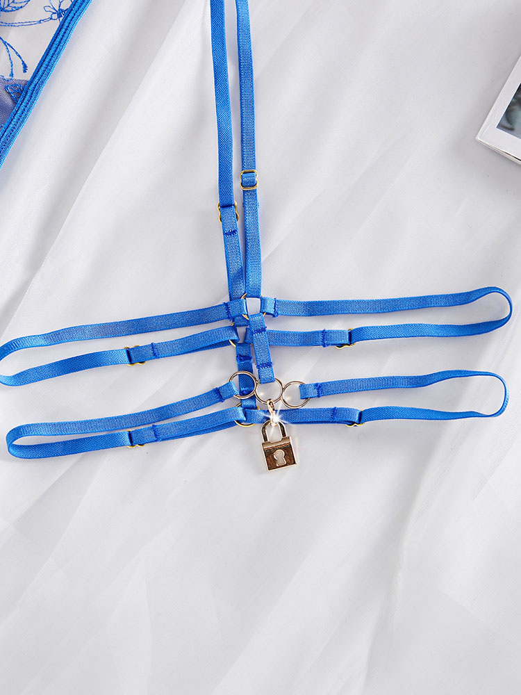 This seductive lingerie set features a deep V-neck bra with intricate royal blue lace detailing and sheer mesh inserts, paired with high-waisted bottoms that include garter straps for stockings. The lock charms add a playful and alluring touch.