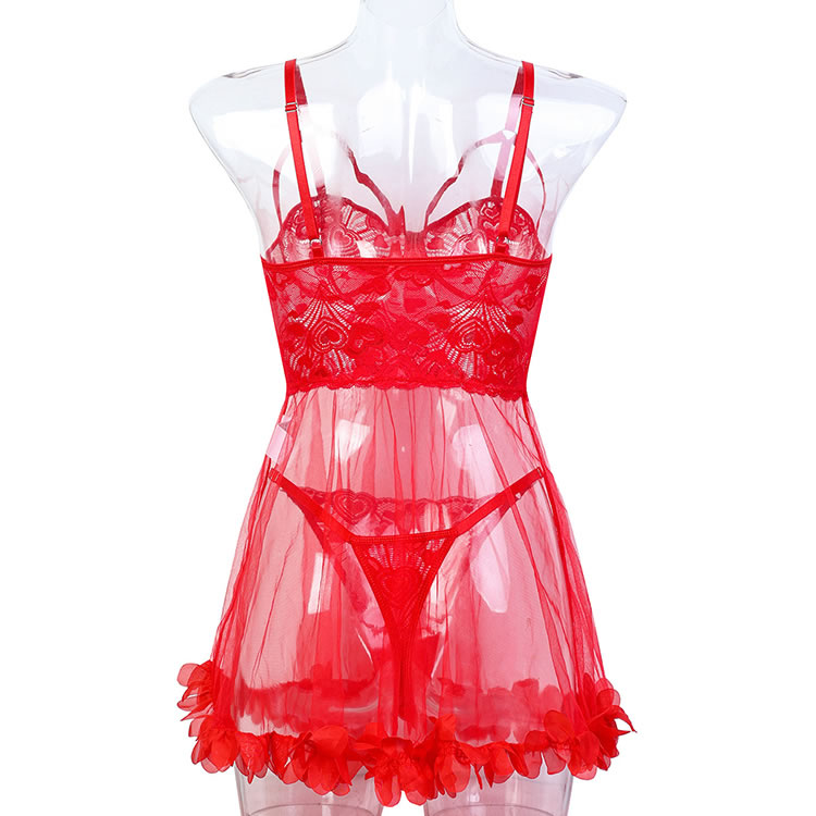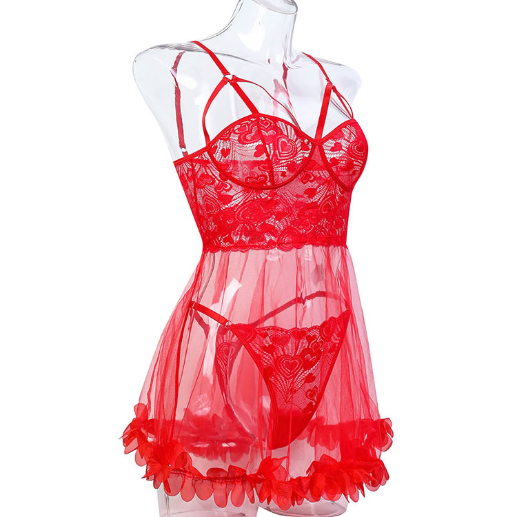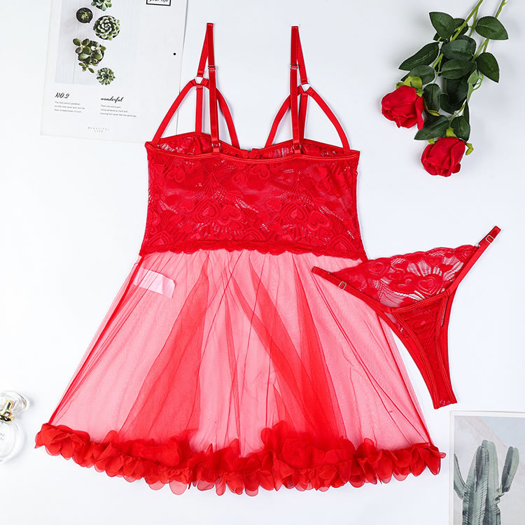 This exquisite lingerie set is designed to captivate with its romantic and elegant design. The bra features a deep V-neckline with intricate heart-shaped lace detailing, adding a touch of sophistication and allure. The sheer mesh fabric enhances the visual appeal, creating a seductive and feminine look. The matching thong complements the bra with the same lace detail, while the ruffled hem adds a charming and playful touch. The strappy design at the neckline and the central keyhole cutout add a modern and stylish element, making it perfect for special occasions or intimate moments.