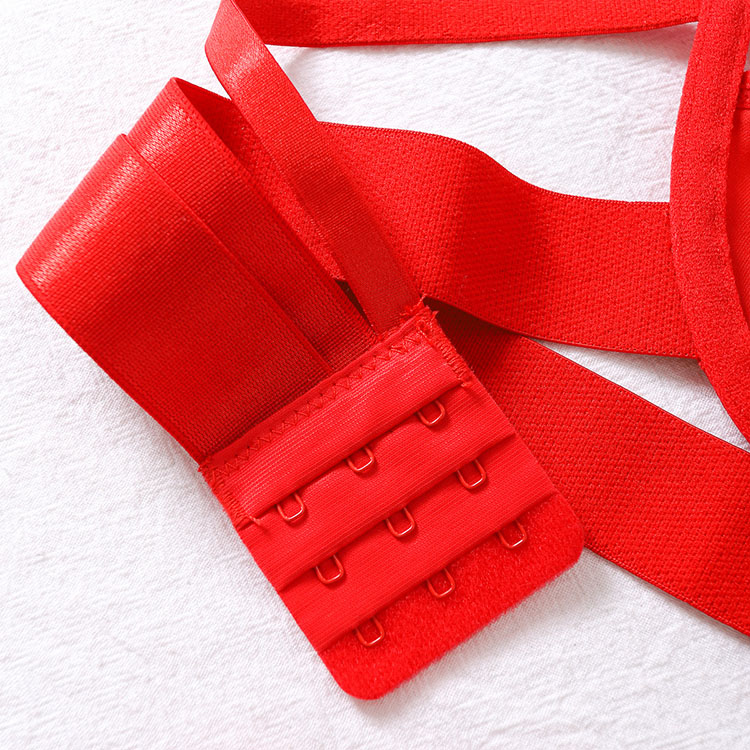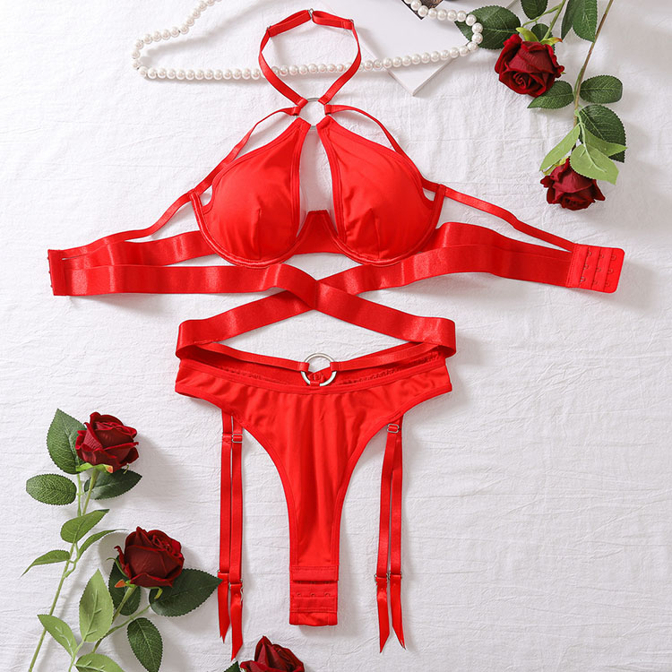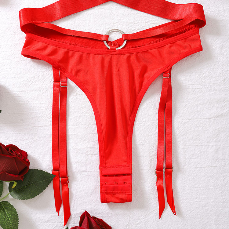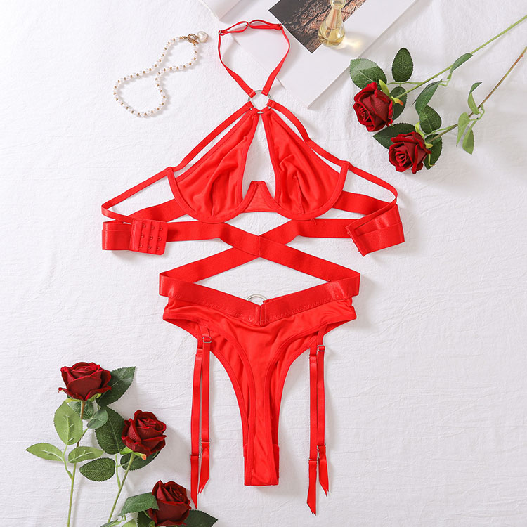 This bold red teddy features a harness design with crisscross straps that accentuate your curves. The halter neck and cut-out details add a touch of daring elegance, making it perfect for those who love to make a statement.