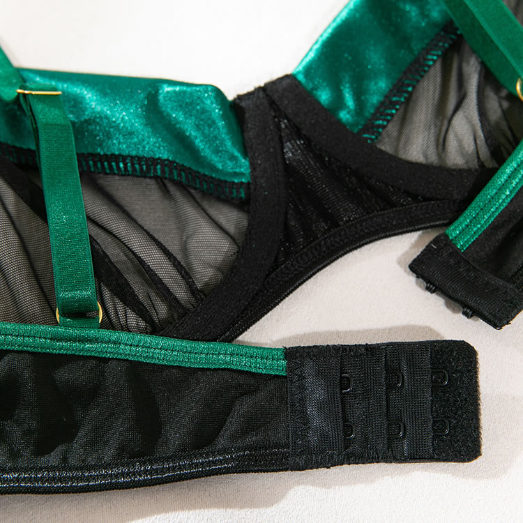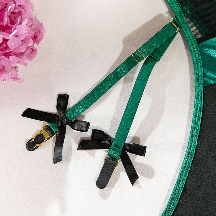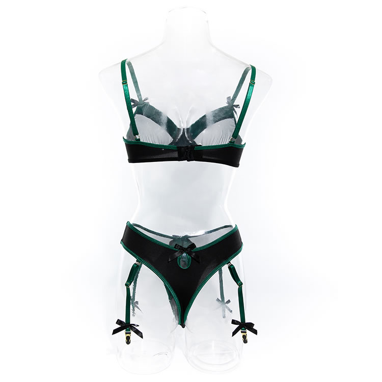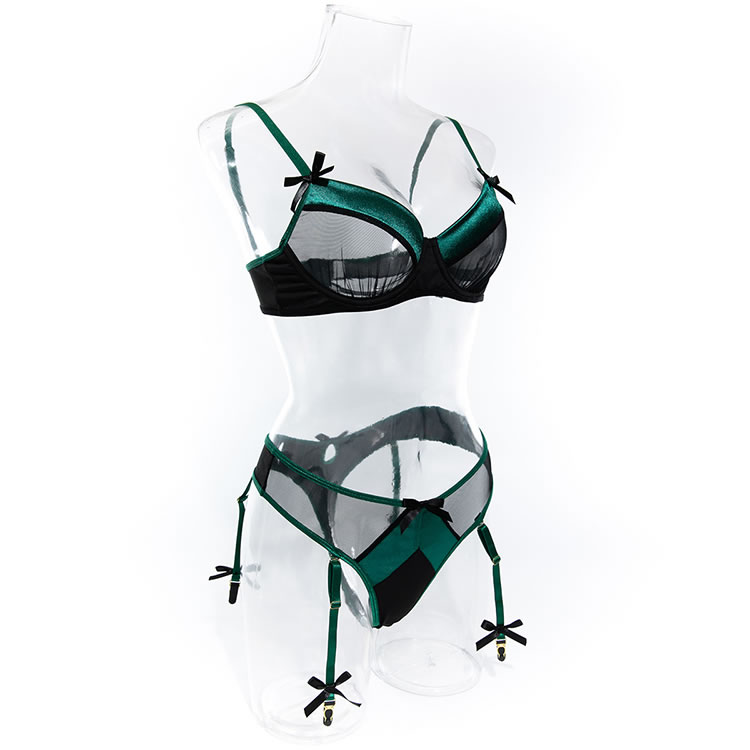 Seduce and enchant in this irresistible bra set, available in black and green. This three-piece mesh ensemble features underwire support, adjustable straps, and a hook and eye back closure. Complete with a high waist cheeky bottom, garter straps, and thigh high stockings, this set is designed to captivate and delight.