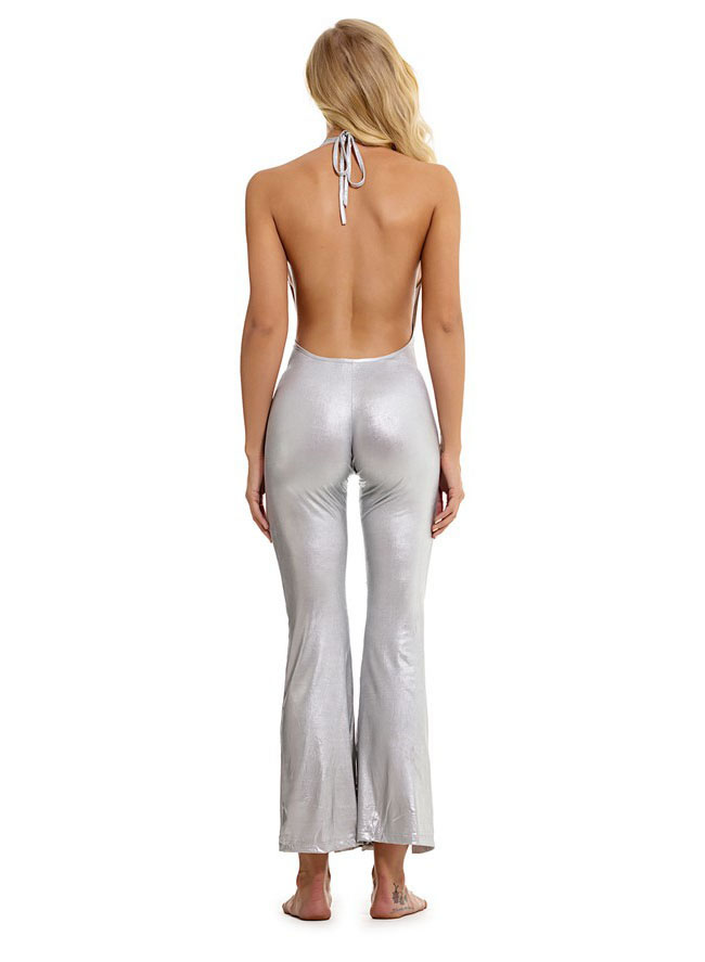 Take charge in this sexy faux leather jumpsuit featuring a deep V-neckline with strappy detailing, halter ties, a low open back, and wide cut legs with front slits.