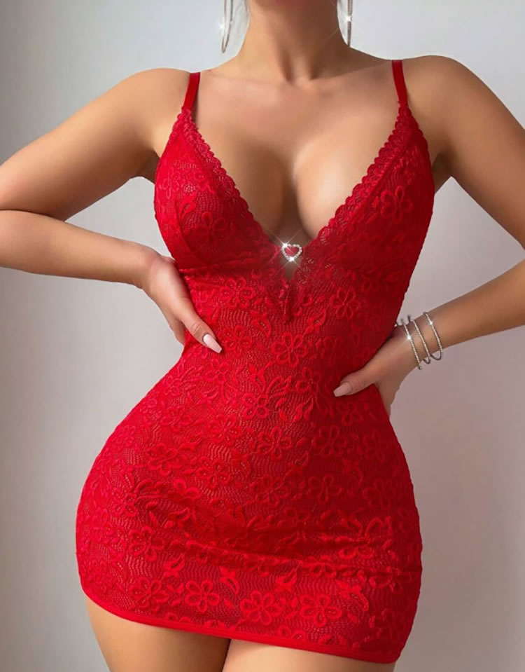 Make a statement in this fiery red lace mini dress designed to turn heads. The deep V-neckline is framed with scalloped lace edges and features a sparkling heart-shaped clasp at the center — adding a touch of playful glamour. Adjustable spaghetti straps offer a customizable fit, while the all-over floral lace pattern hugs your curves for a flattering silhouette. The back reveals satin bows detail that enhances both style and adjustability. Perfect for Valentine’s Day, anniversaries, or whenever you want to feel bold, beautiful, and completely confident.