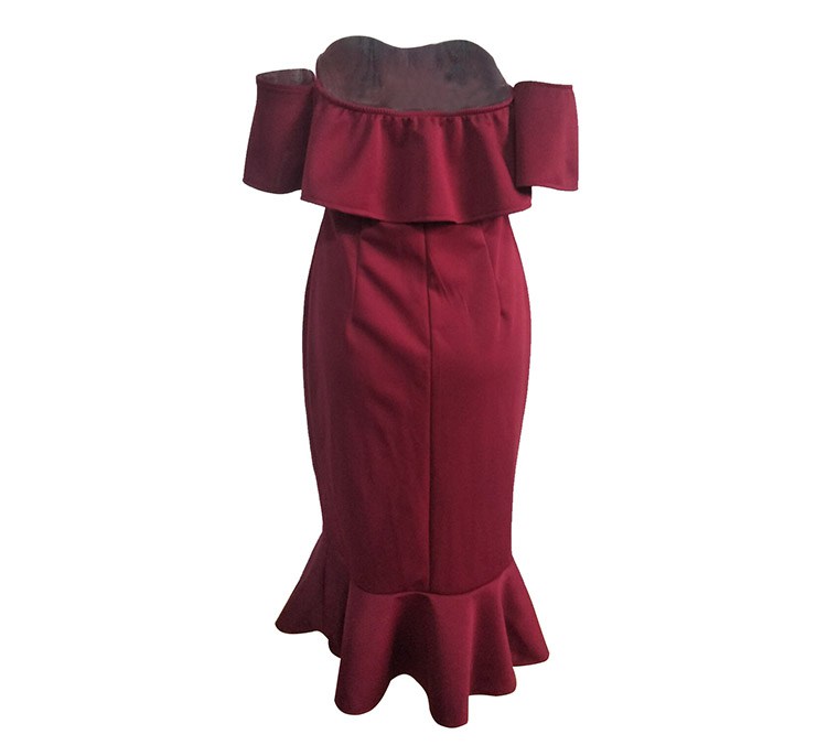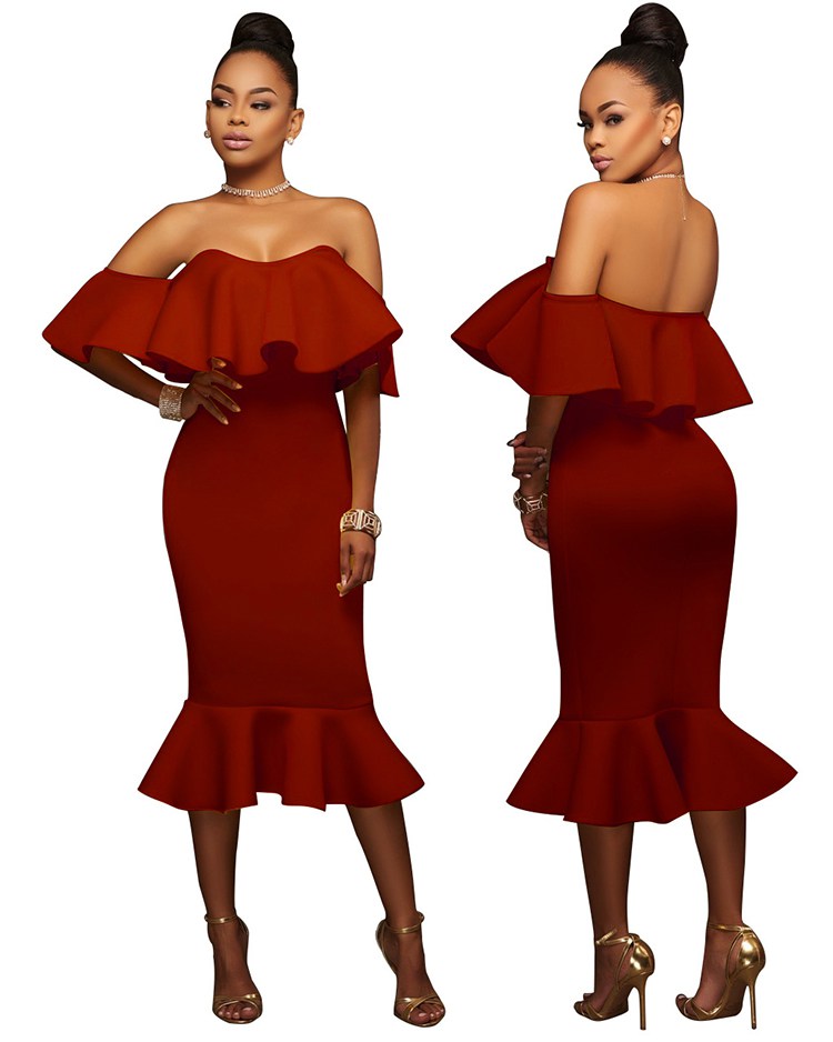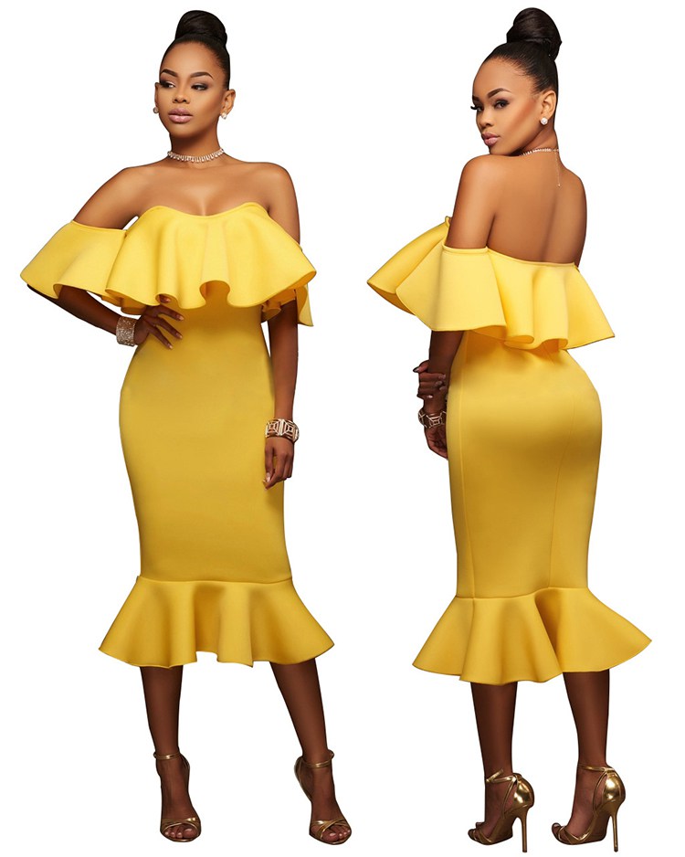 This off-the-shoulder dress with a modern ruffle design. We like the sexy off-shoulder design that shows your beautiful collarbone elegantly with flounce overlay around. Finished with mermaid hemline cut at midi length.