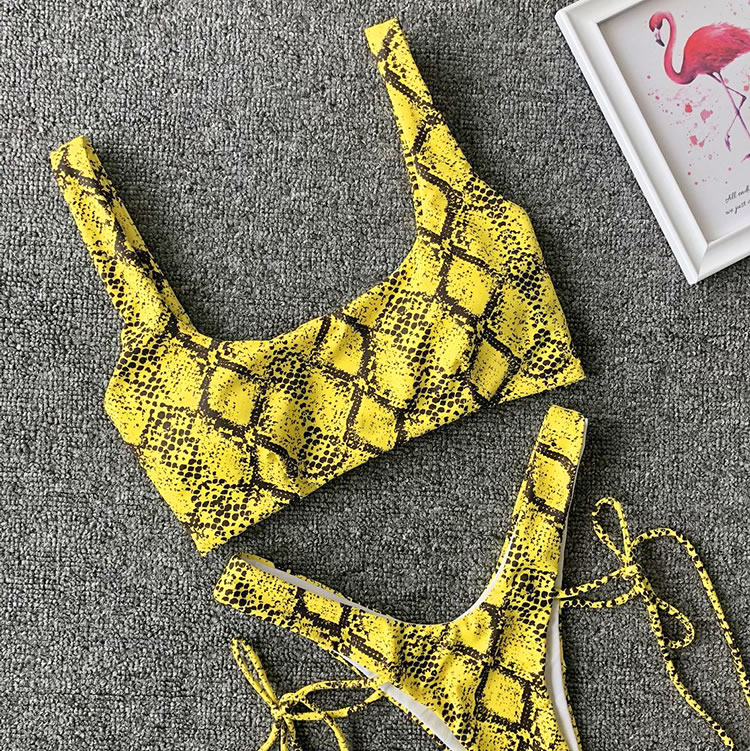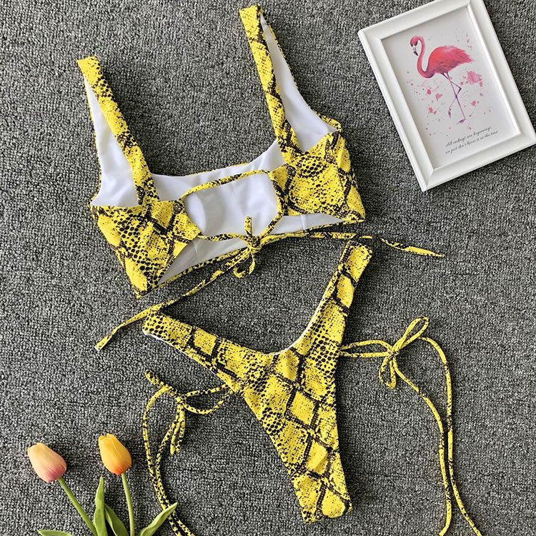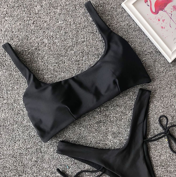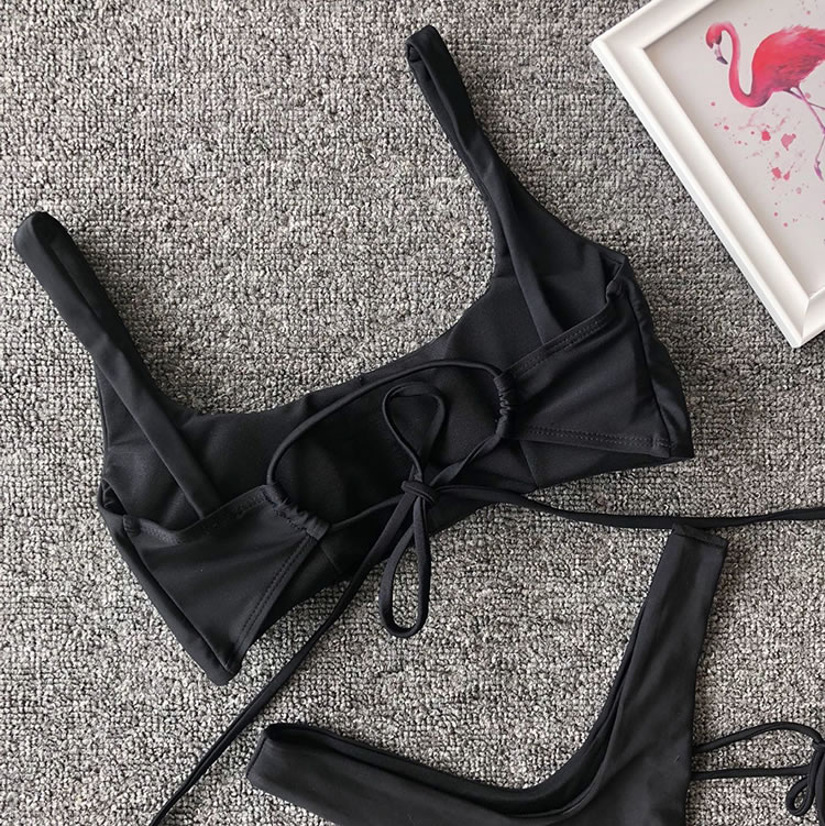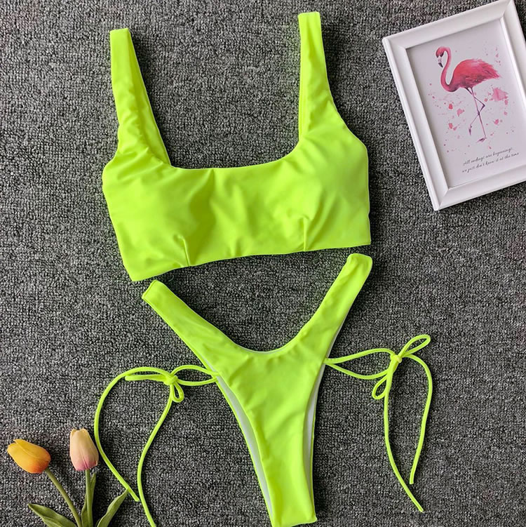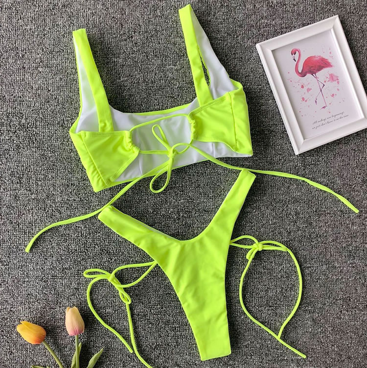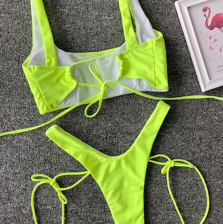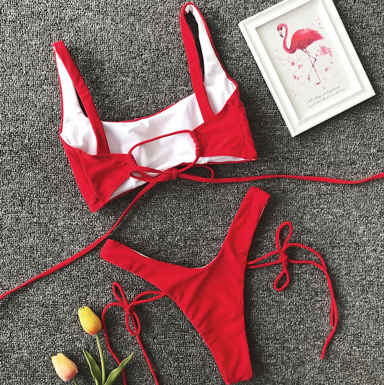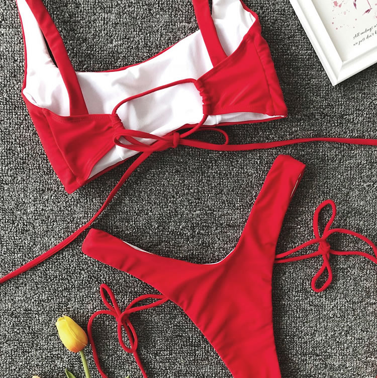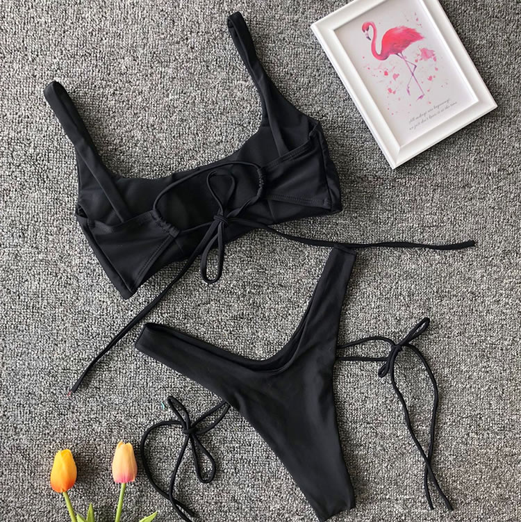 Take a dip in this strappy two piece swimsuit featuring a square neckline, shoulder straps, a lace-up back with a tie closure, matching bottoms with a low cut front, high cut sides with side tie closures, a thong cut back,