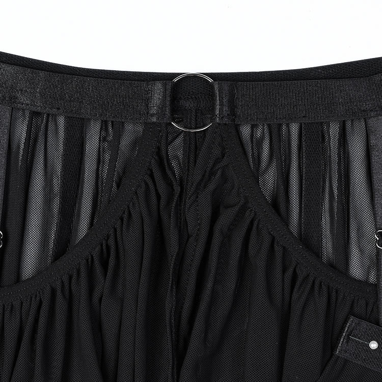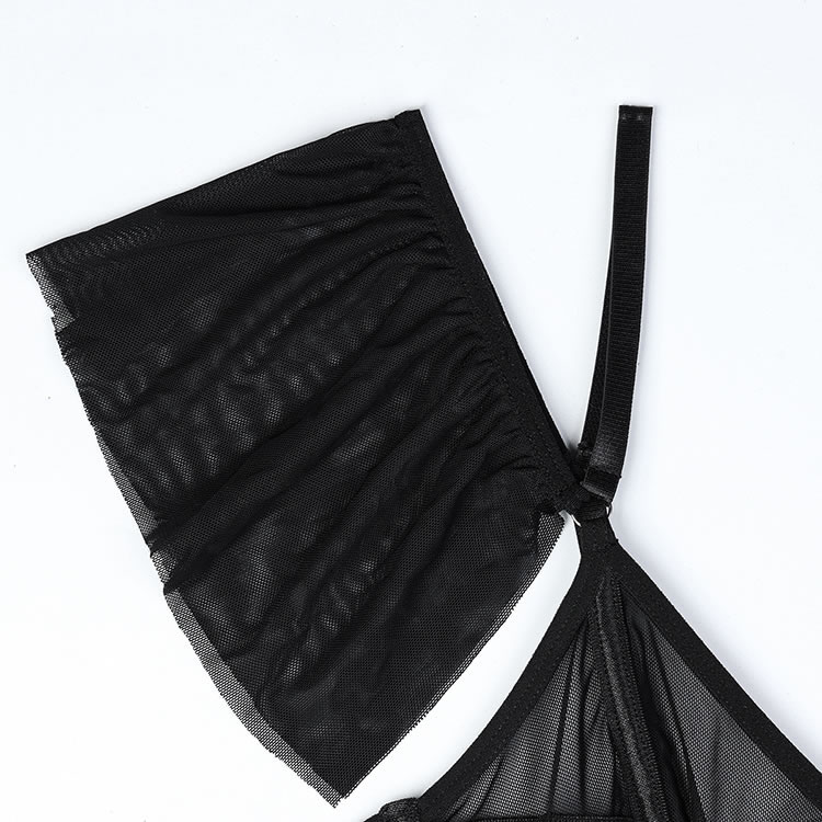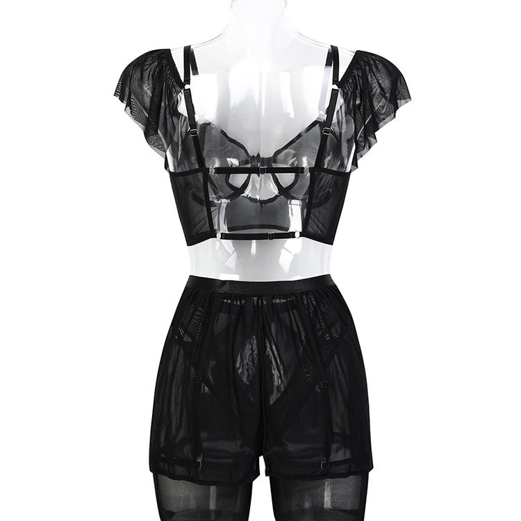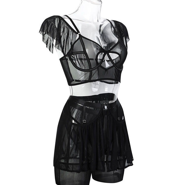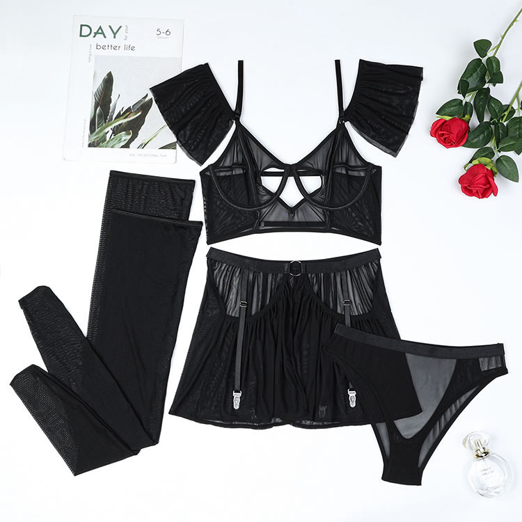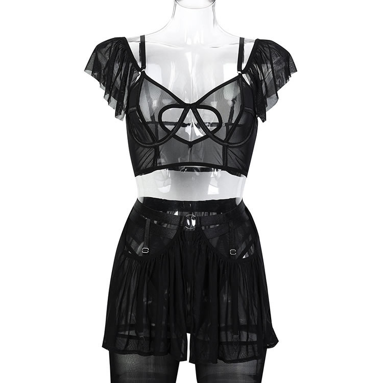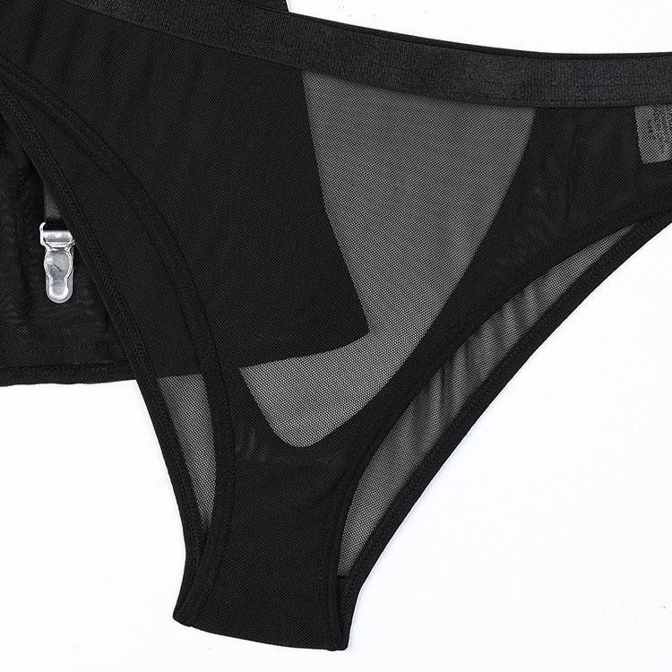 This lingerie set features a minimalist black bralette made from sheer mesh fabric, designed to flatter and accentuate natural curves. The front showcases a stylish cut-out detail that adds a bold yet subtle touch of sensuality. Thin adjustable straps offer comfort and flexibility, while the open back design enhances breathability. Paired with a matching garter skirt and thigh-high stockings, this set is perfect for those who want to embrace their confidence without overdoing it.