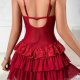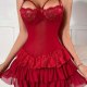This eye-catching red lingerie dress blends bold style with feminine charm. The top features a delicate lace panel across the bust with a sweet bow accent, while thin straps provide a graceful silhouette. The back includes a cutout design with a supportive band for added structure. The skirt is crafted from layered tulle and lace, creating a voluminous, playful look that adds movement and flair. Perfect for making a statement during intimate moments or special occasions.