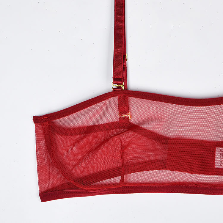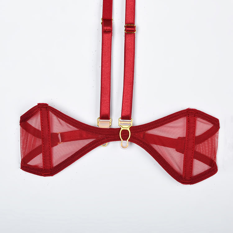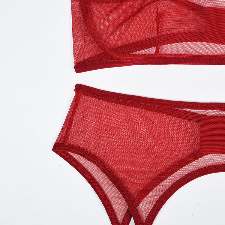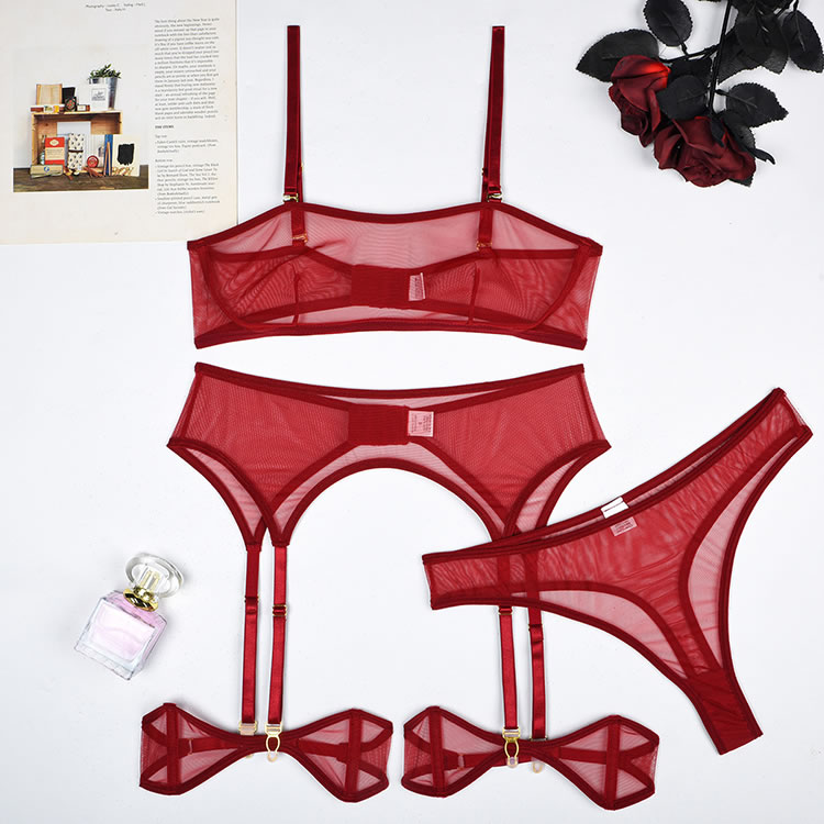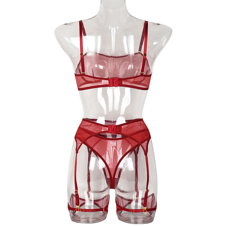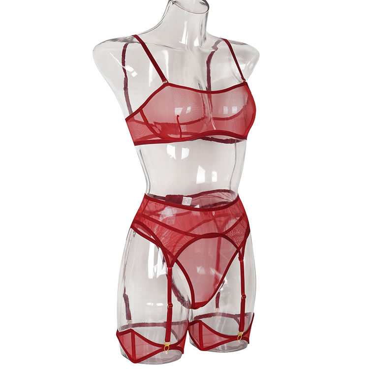Give your babe a sexy invite in this mesh bra set featuring sheer mesh cups, adjustable shoulder straps, a hook and eye back closure, a matching mesh garter belt, adjustable garter straps, wraparound leg garters, and a matching mesh panty.