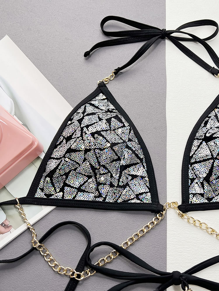 Turn heads in this shimmering diamond-print bikini, featuring intricate chain detailing that adds a touch of glamour. The sparkling texture catches the light, making it perfect for those who want to dazzle at the beach or poolside. The flattering cut ensures you feel confident and stylish.