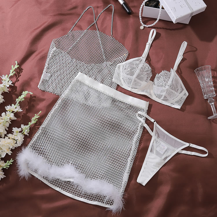 This striking lingerie set is perfect for making a statement. The shimmering silver mesh top features intricate detailing that catches the light, while the white undergarments provide a clean contrast. The skirt's fluffy trim adds a playful touch, ensuring you feel both confident and stylish. Ideal for those who want to stand out in any setting.