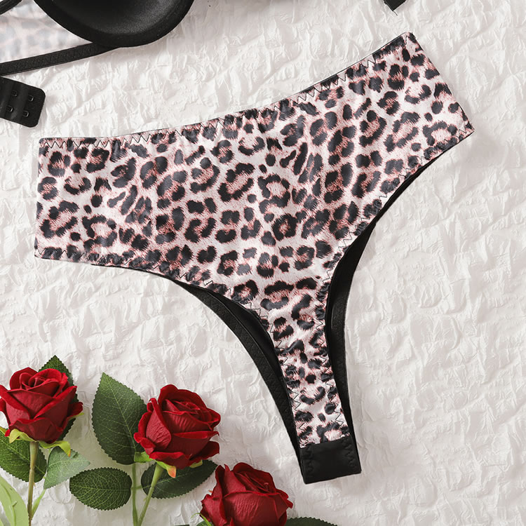 Unleash your wild side with this striking bra set. It features molded underwire cups adorned with a fierce leopard print, adjustable spaghetti straps, and a hook-and-eye back closure. The matching panty complements with a front keyhole opening and a cheeky cut back, adding a touch of bold allure to your ensemble.