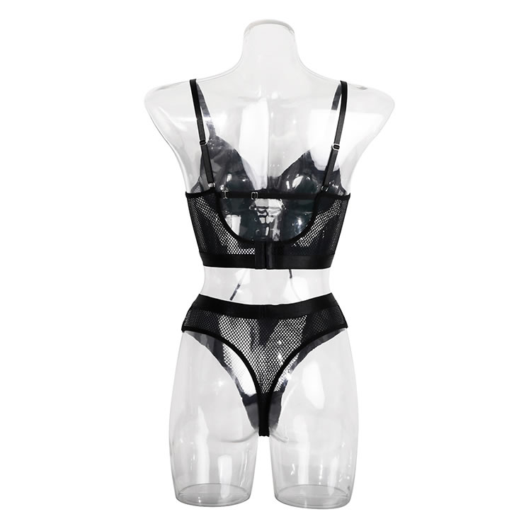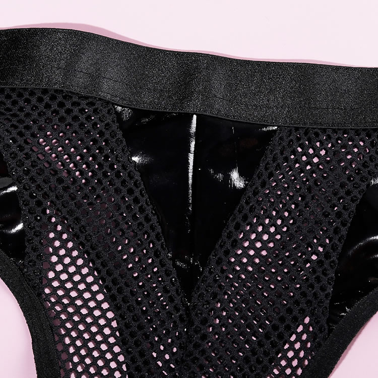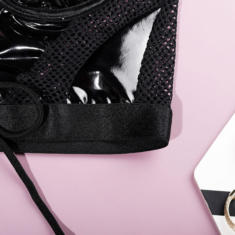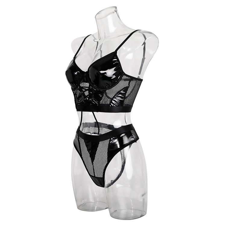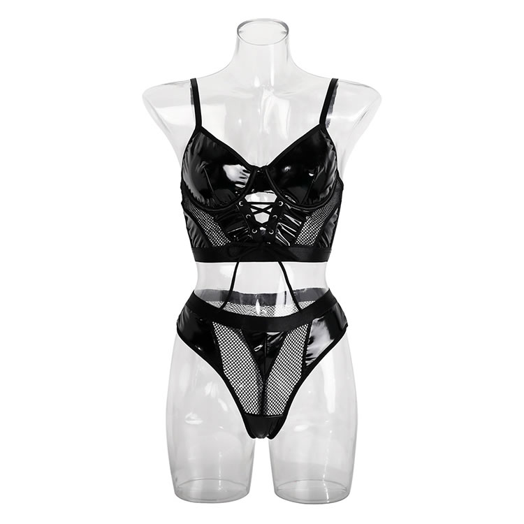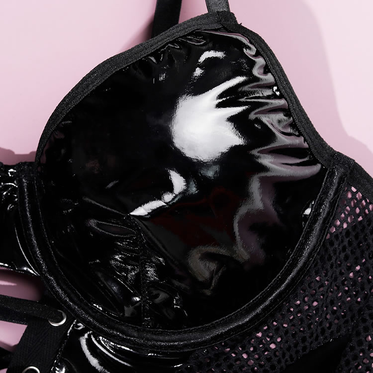 This bold black patent leather bra set features a striking lace-up detail that adds a touch of edginess and allure. The combination of shiny patent leather and mesh fabric creates a captivating contrast, while the form-fitting design accentuates your curves. Perfect for those who want to make a statement in their intimate moments.