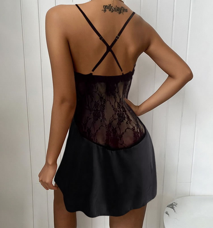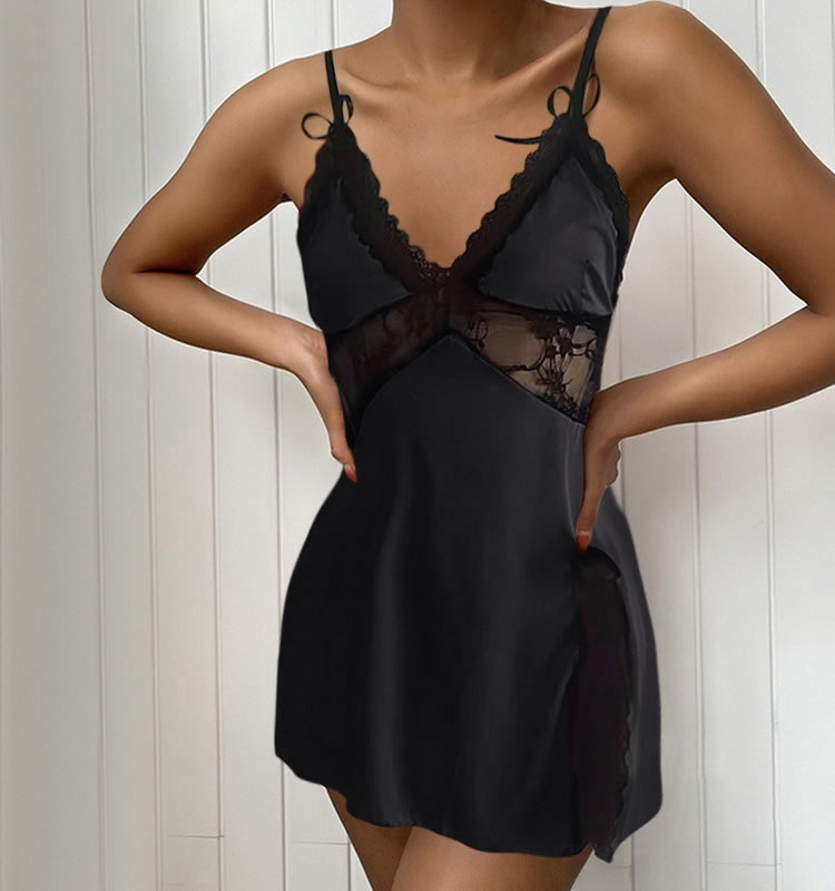 This elegant black satin chemise is designed to exude confidence and allure. The intricate lace detailing at the neckline and waist adds a touch of sophistication, while the soft satin fabric ensures ultimate comfort. The side slit enhances its flattering silhouette, making it perfect for those who appreciate stylish and comfortable lingerie.