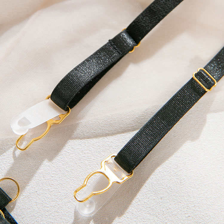Spice up your evening in this exclusive bra set featuring sheer lace underwire cups with peekaboo open panels, adjustable spaghetti straps, a hook and eye back closure, a matching garter belt with adjustable garter straps and a back hook closure, wraparound leg garters, and a matching thong.