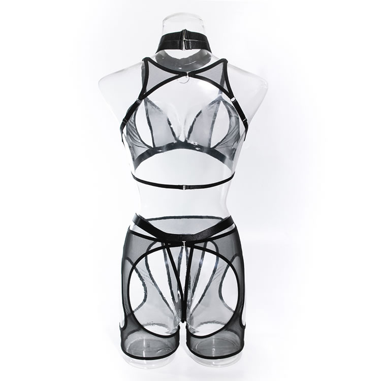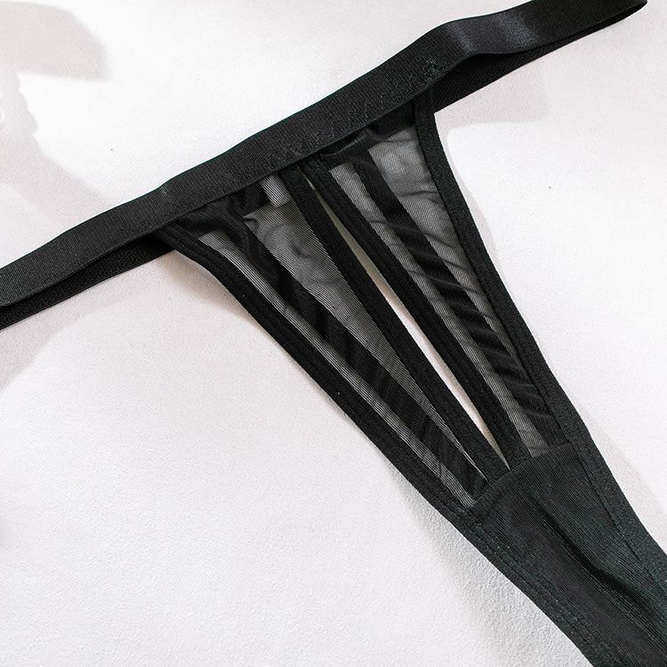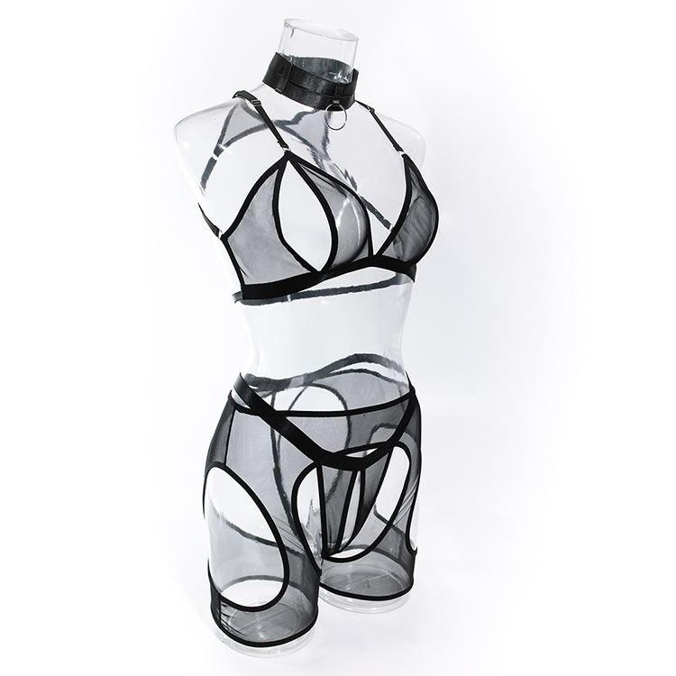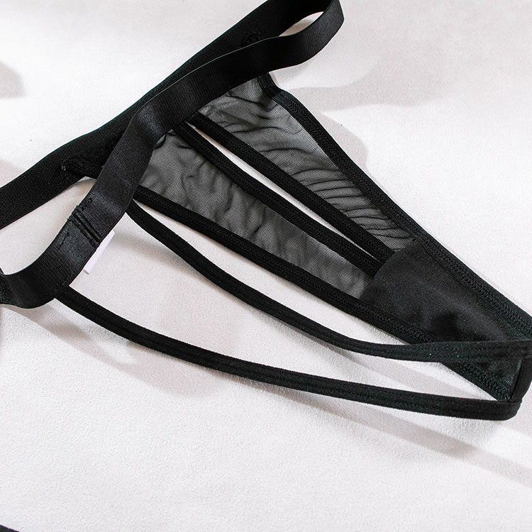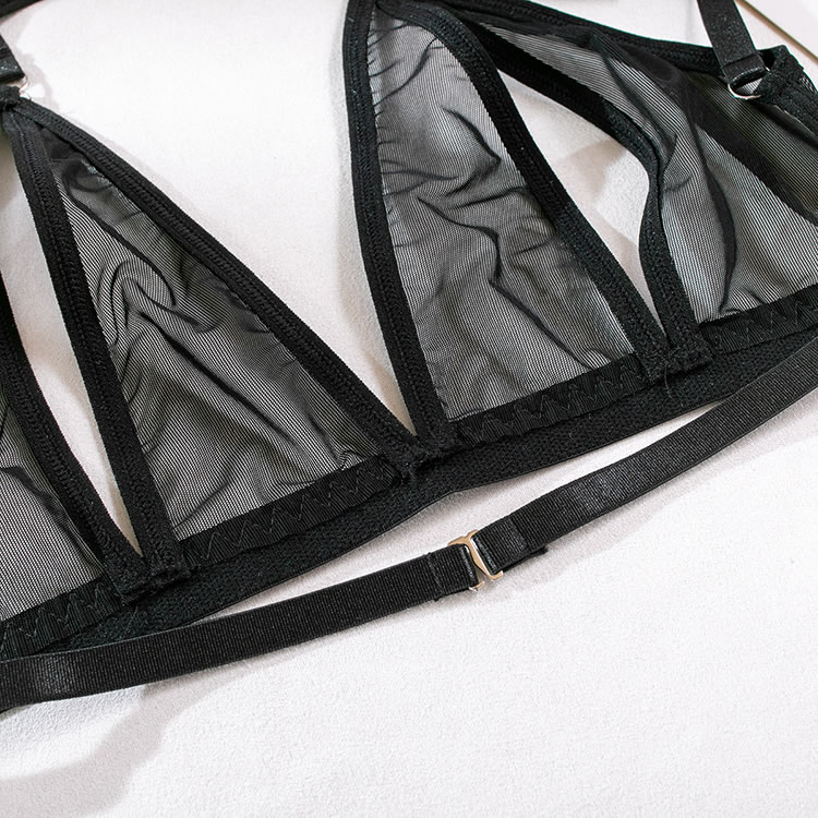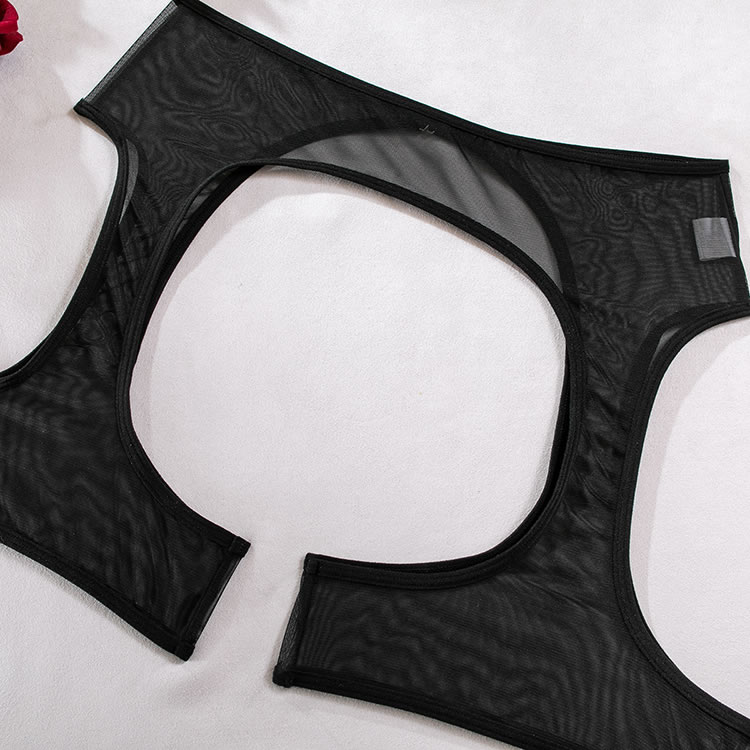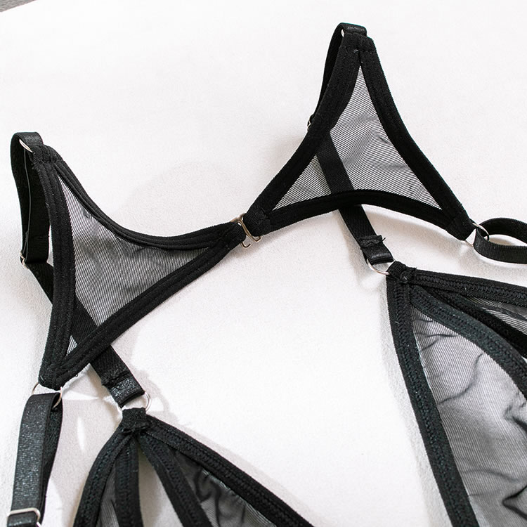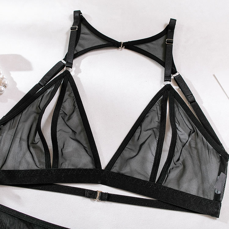 Spice up your evening in this exclusive bra set featuring sheer mesh triangle cups with peekaboo open panels, adjustable spaghetti straps, a hook back closure, a matching garter belt with wraparound leg garters and a back hook closure, and a matching thong with an open crotch.
