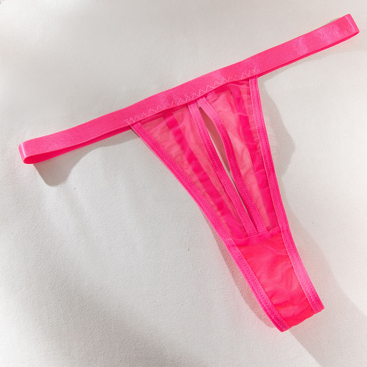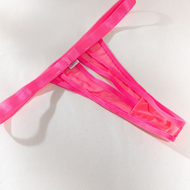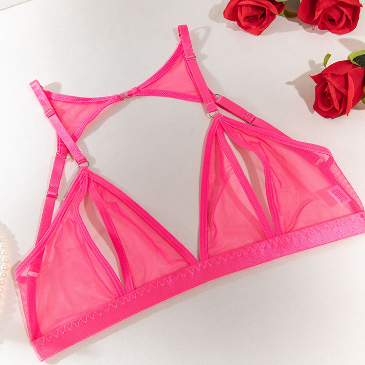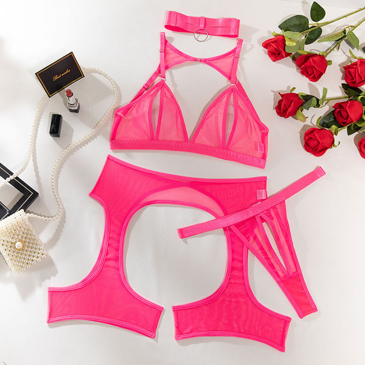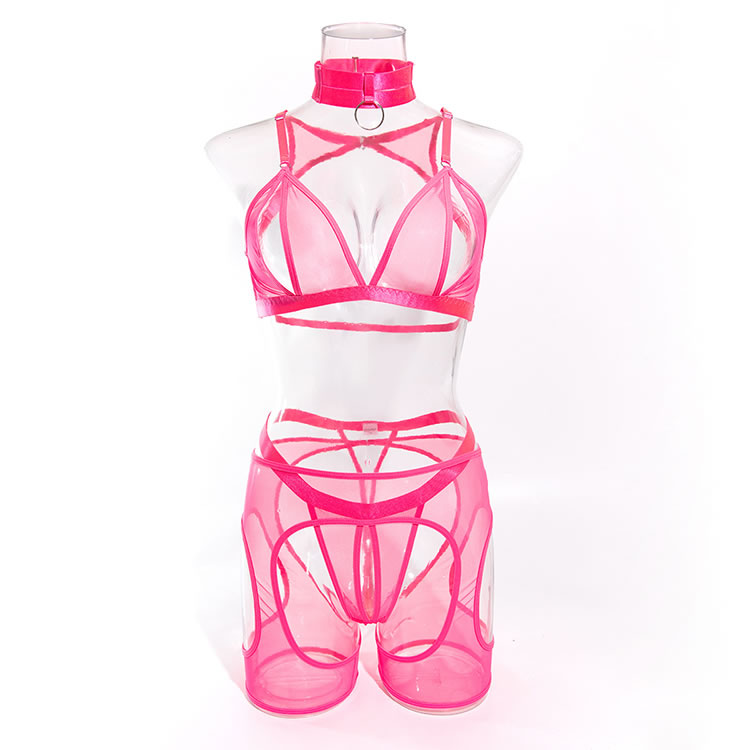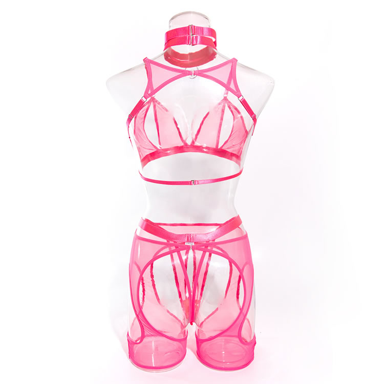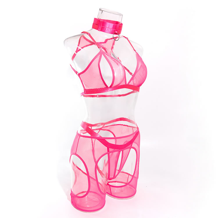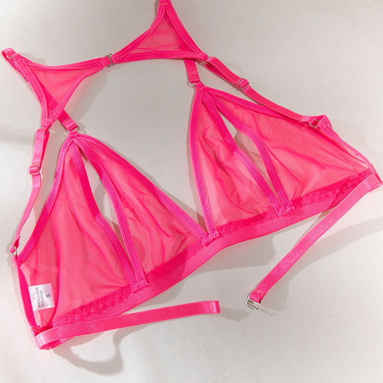 Spice up your evening in this exclusive bra set featuring sheer mesh triangle cups with peekaboo open panels, adjustable spaghetti straps, a hook back closure, a matching garter belt with wraparound leg garters and a back hook closure, and a matching thong with an open crotch.