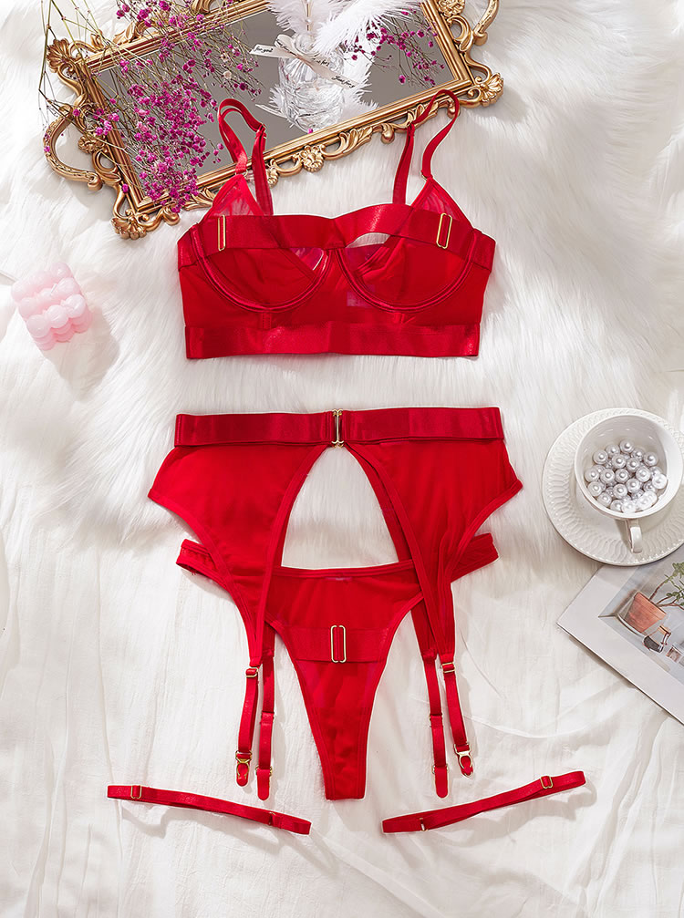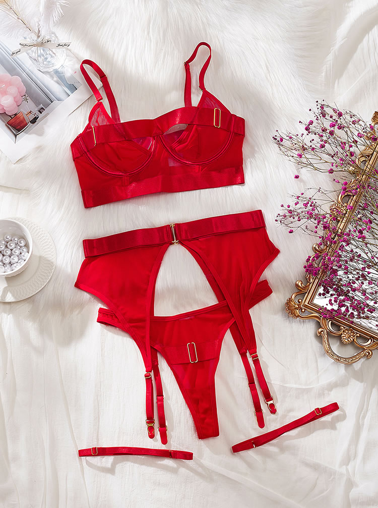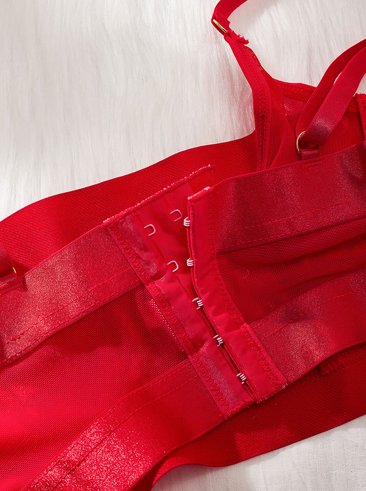 Ignite desire in this red mesh bra set. It includes a sheer underwire bra with adjustable straps and hook-and-eye closure, a garter belt with adjustable straps and leg garters, and a matching thong panty. Tempt and tease with every curve.