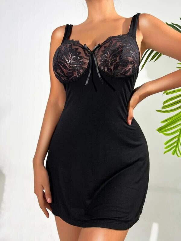 Don't leave bed in this sexy nightgown featuring sheer lace cups with satin bow accents, and a slouchy bodice and skirt.
