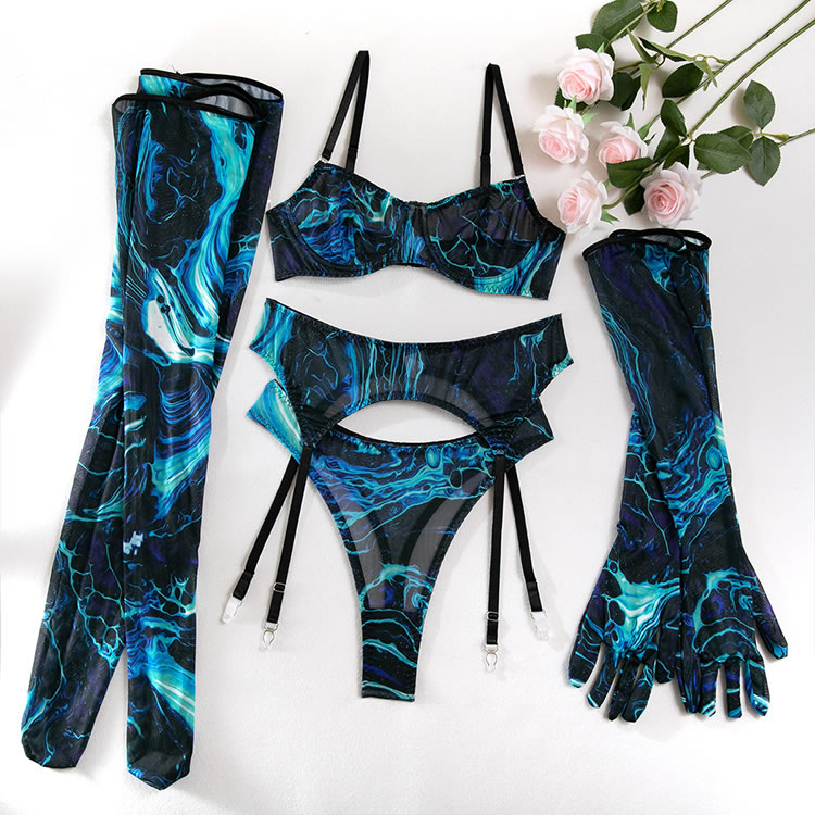 Dark and daring, take your lingerie to the next level with this enticing bra set featuring underwire cups, adjustable spaghetti straps, a hook and eye back closure, a matching garter belt with adjustable garter straps, thigh high stockings, long gloves, and a matching panty.