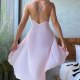 This charming two-piece set combines elegance and flirtation with a soft pink color palette and feminine details. The lace-trimmed bralette features a sweet bow at the center and thin spaghetti straps that transition into a stylish crisscross back on the accompanying robe. The sheer, flowy robe drapes beautifully over the body, adding a touch of drama and grace. Paired with a matching thong, this ensemble is perfect for lounging or creating a romantic atmosphere.