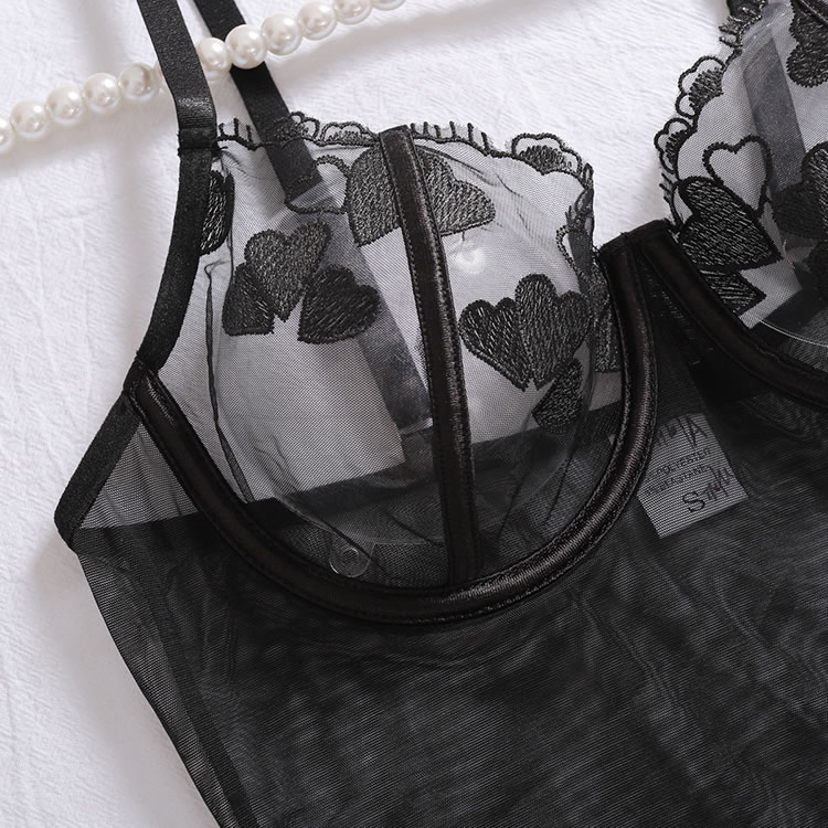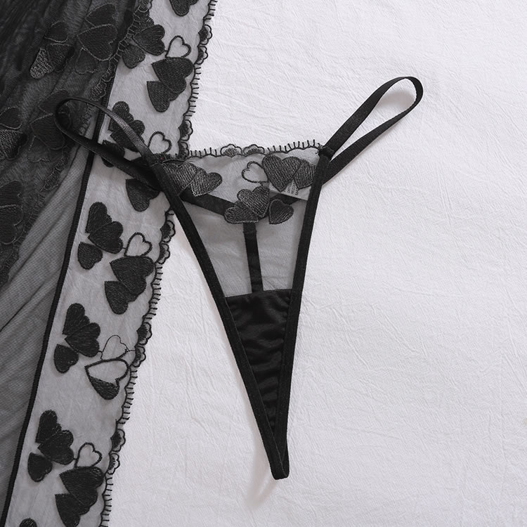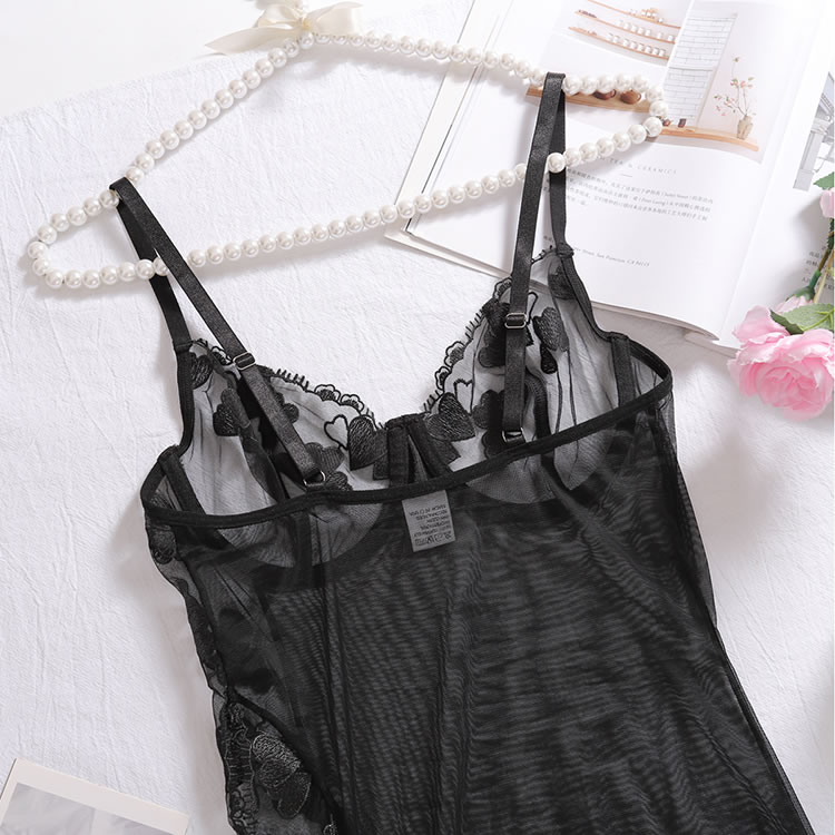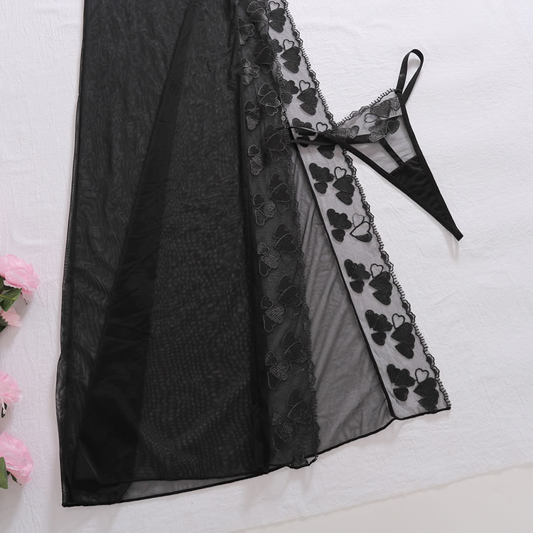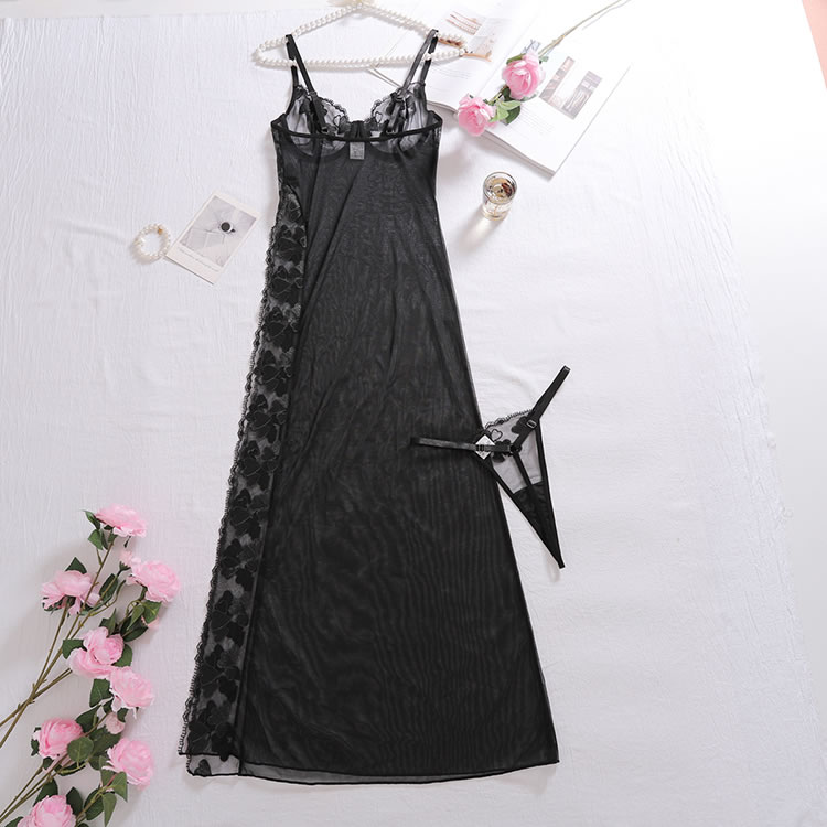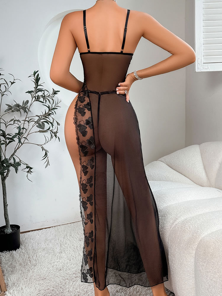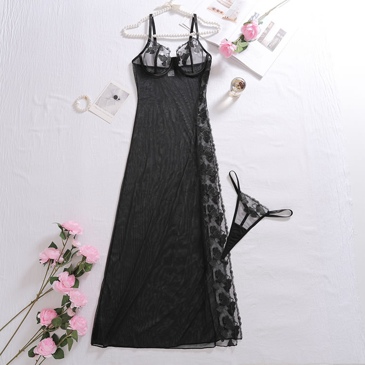 Indulge in irresistible allure with this sensual lingerie gown. Adorned with sheer mesh underwire cups and intricate embroidery, it features adjustable spaghetti straps and a sheer bodice. The gown's flowing skirt boasts high side slits for added seduction, and it comes with a matching G-string. Perfect for a night of romance, this gown blends elegance with daring design to captivate and enchant.