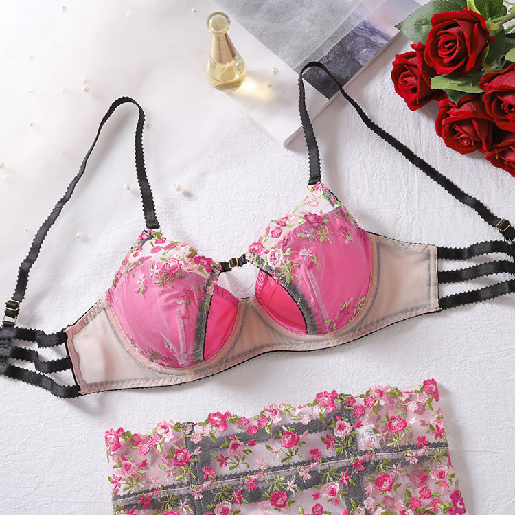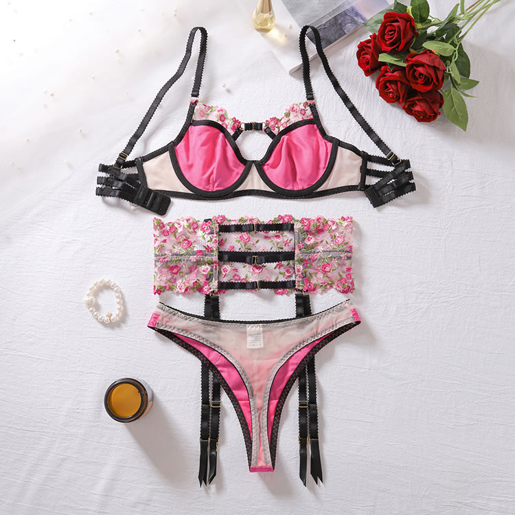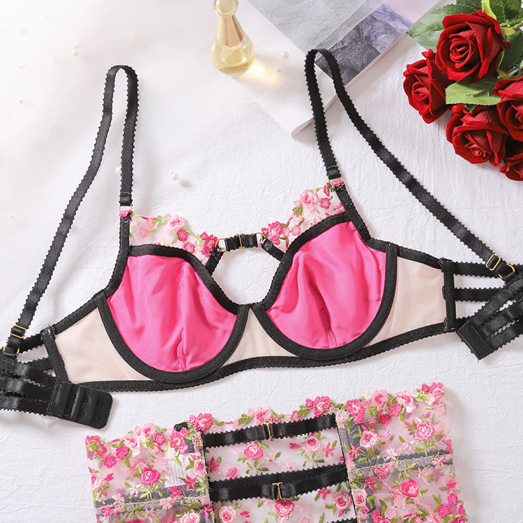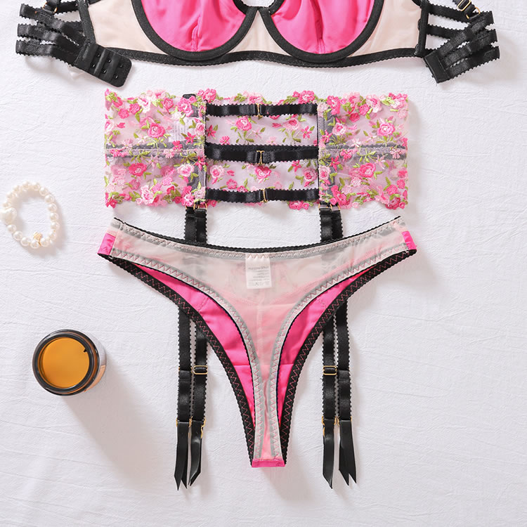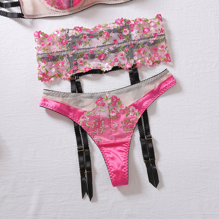 This enchanting lingerie set features vibrant pink satin and delicate floral embroidery, creating a romantic and feminine look. The structured bra with keyhole detailing pairs beautifully with the sheer embroidered garter belt and matching thong. Adjustable straps and garters ensure a perfect fit, making this set a captivating choice for special occasions.