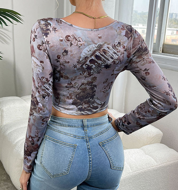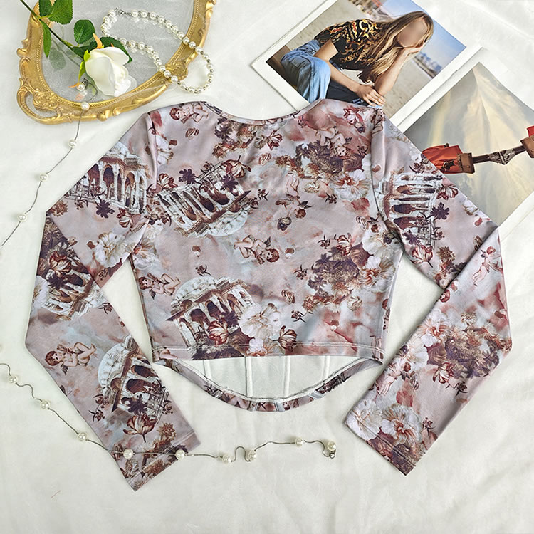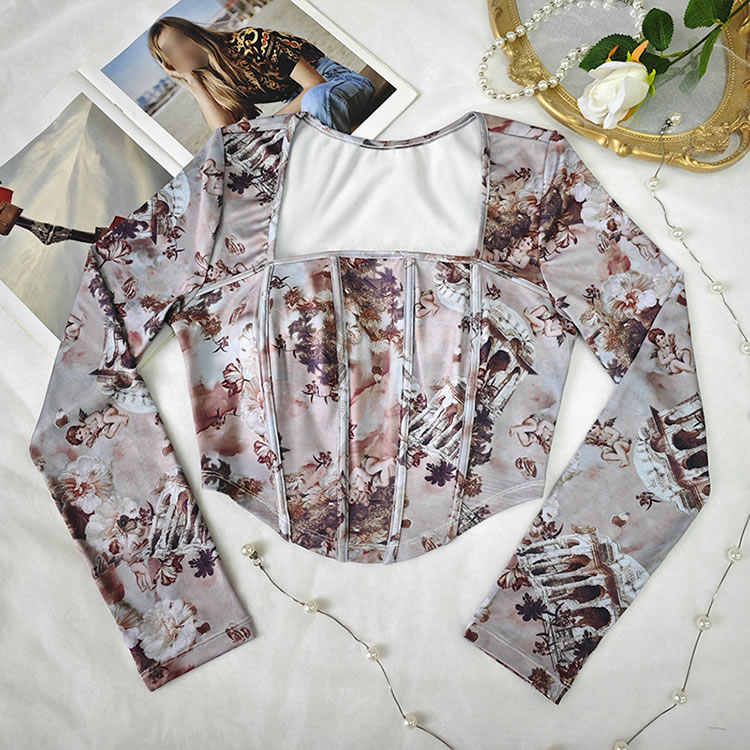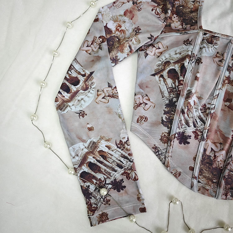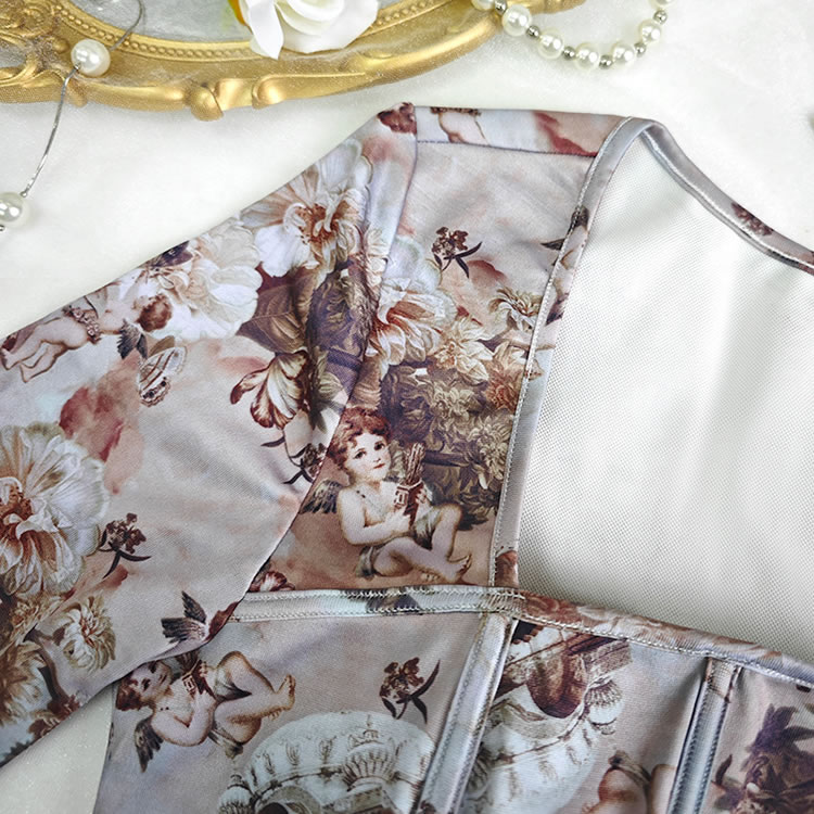 This elegant bustier lingerie set features a stunning floral and angelic print on a muted lavender background, combining vintage charm with modern sophistication. The square neckline enhances the décolletage beautifully, while the fitted design accentuates the figure. The long sleeves add a touch of modesty and elegance, making it perfect for both intimate moments and stylish outings. The intricate print and sleek silhouette ensure you feel confident and alluring.
