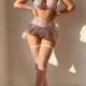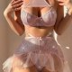 This eye-catching ensemble blends modern design with vintage-inspired romance. Crafted from glittering mesh fabric, the bralette features a cut-out neckline and soft satin straps that accentuate the shoulders. Paired with high-cut skirt adorned with layered tulle and a bow detail at the waist, it’s a celebration of confidence and style. Whether worn as loungewear or a statement piece, this set radiates charm and sophistication.