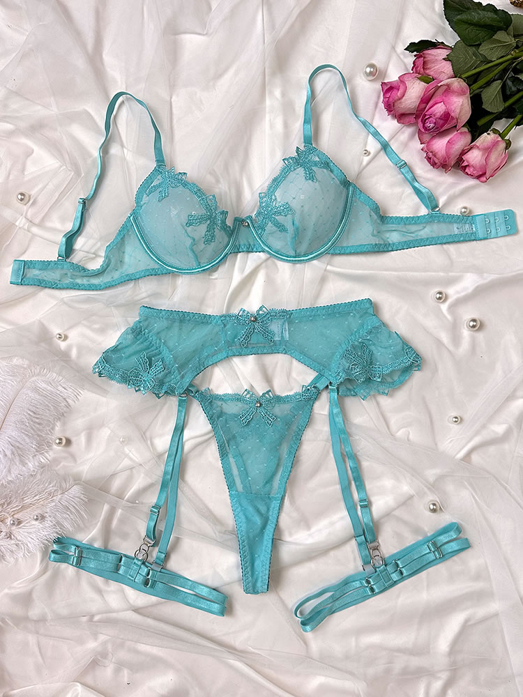 Turn down the lights and set the mood in this sexy lace bra set featuring sheer underwire cups, adjustable spaghetti straps, a hook and eye back closure, a matching garter belt with a hook and eye back closure, adjustable garter straps, wraparound leg garters, and a matching thong.