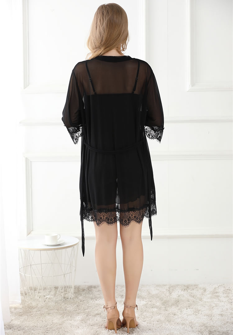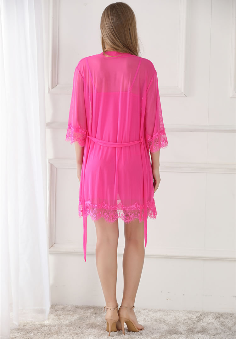Intensify your sexy look with this stunning robe set featuring a chemise with sheer lace cups, a satin bow accent, adjustable spaghetti straps, a sheer mesh bodice with a lace hem, and a matching mesh robe with 3/4 sleeves, a beautiful eyelash lace trim, and a matching thong panty.