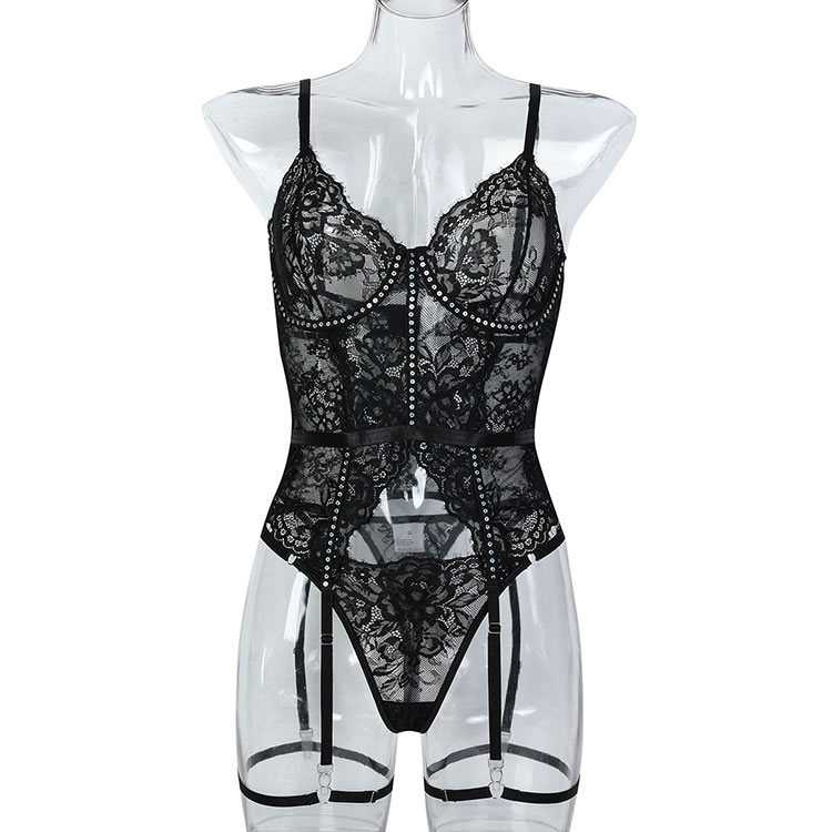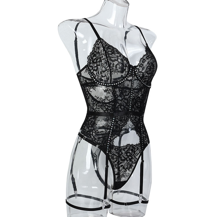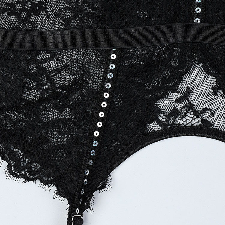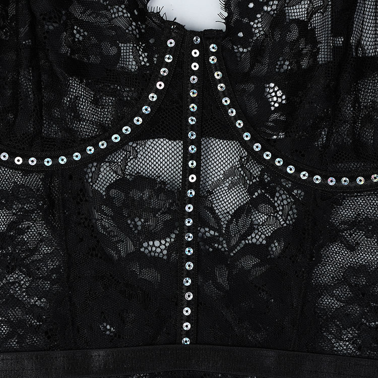 This elegant black lace corset lingerie set blends timeless sophistication with a touch of sparkle. The sheer lace bodice is delicately adorned with shimmering rhinestones, adding a hint of glamour to the design. Underwired cups provide gentle support and a flattering lift, while the structured silhouette enhances your natural curves.