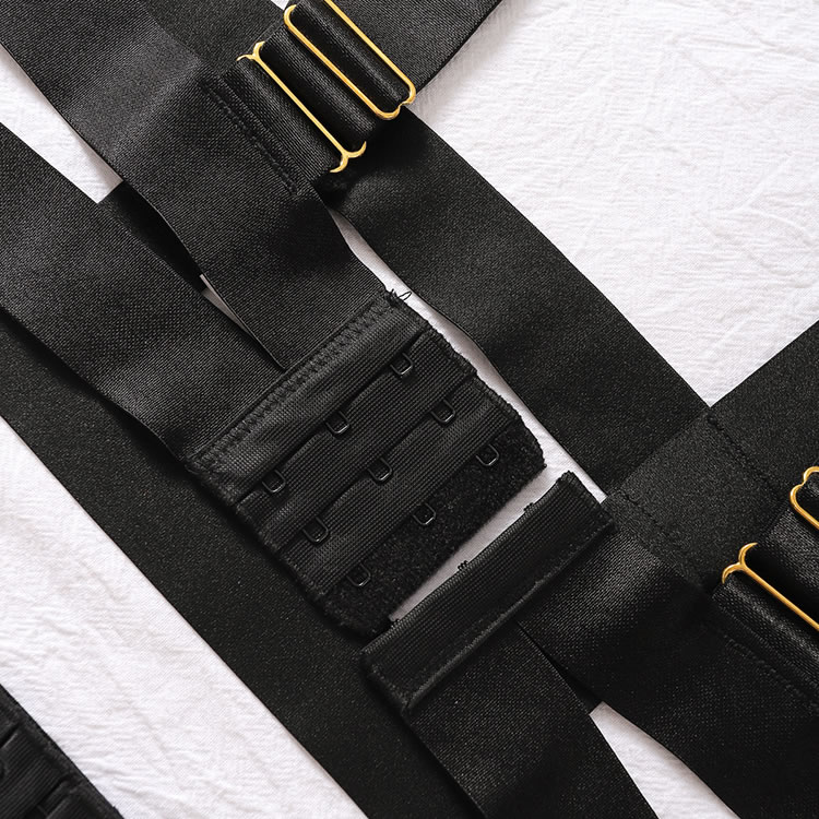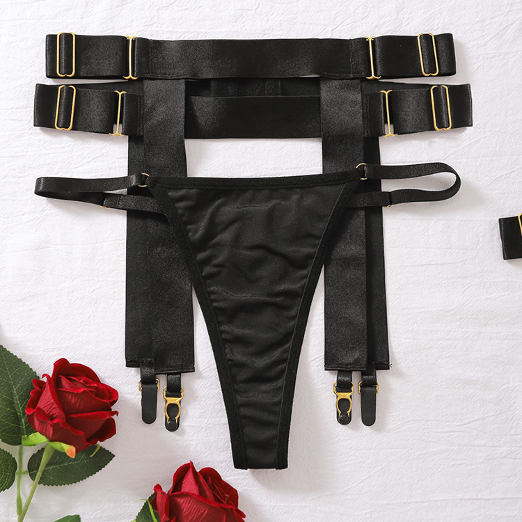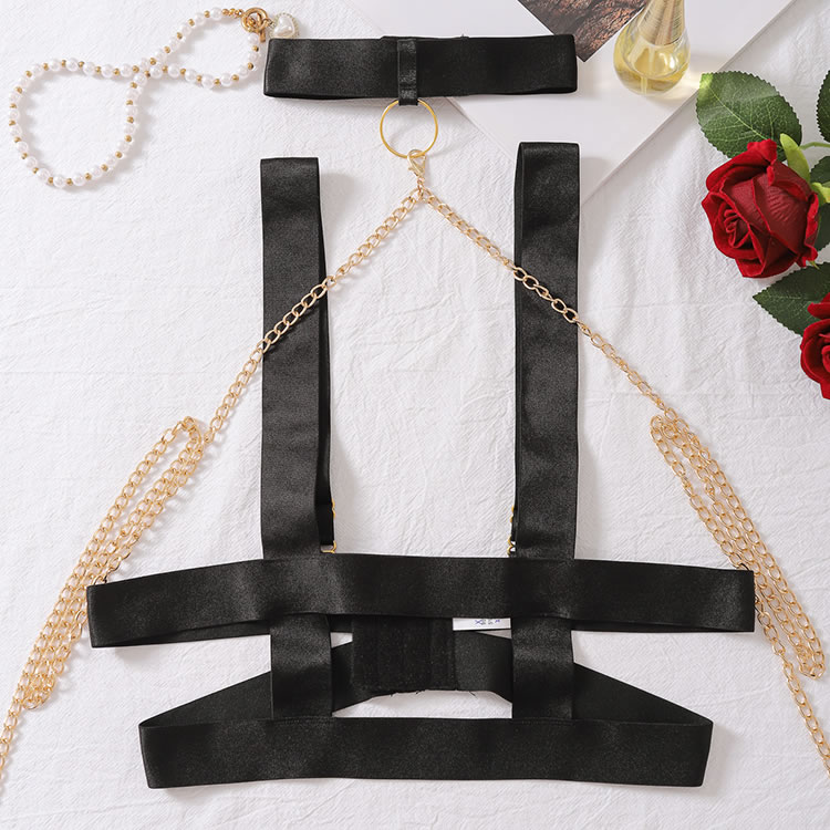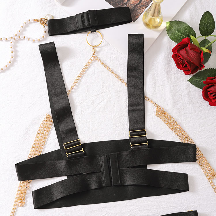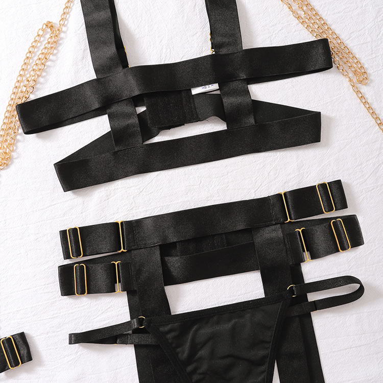 Flaunt your sultry side in this daring bra set, featuring strappy open cups, adjustable spaghetti straps, a hook and eye back closure, a choker with draping chains, wrist restraints, a matching high-waisted garter belt with adjustable straps, and a matching thong.