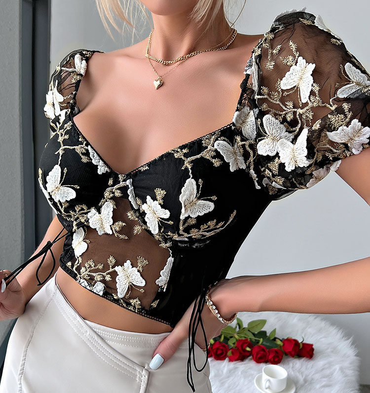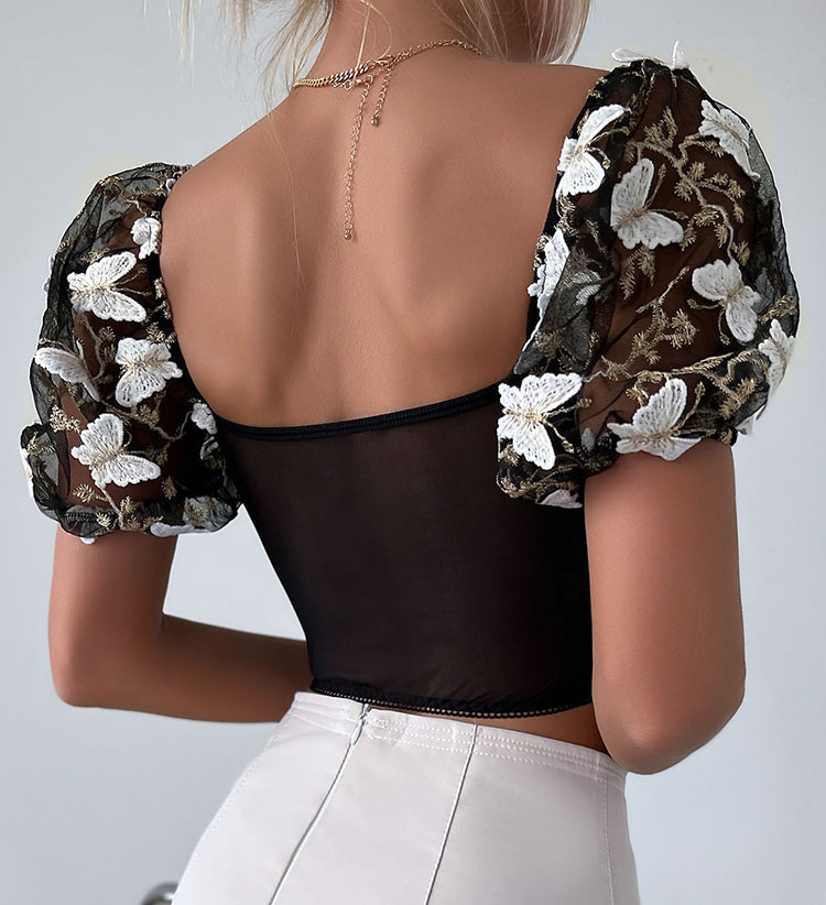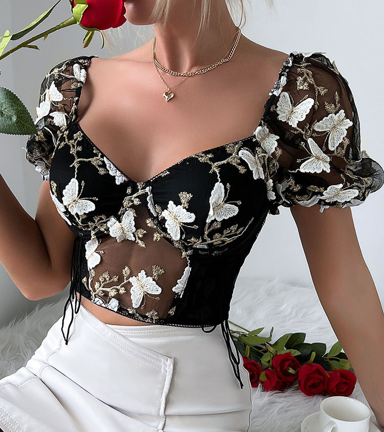 Elevate your style with this romantic black lace-up corset top. The detailed butterfly and floral embroidery on the sheer mesh fabric provides a blend of elegance and allure. The adjustable side laces ensure a customizable fit, making it versatile for various occasions.