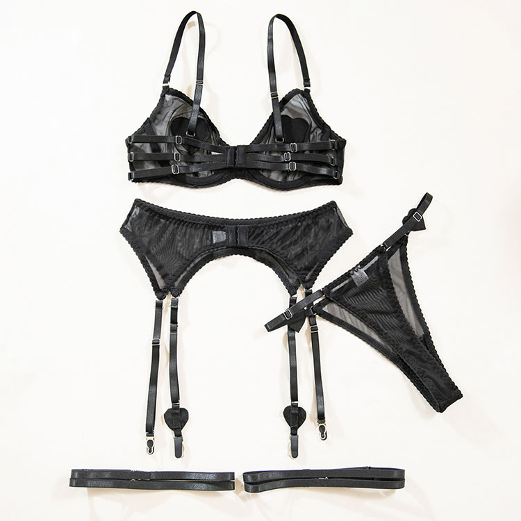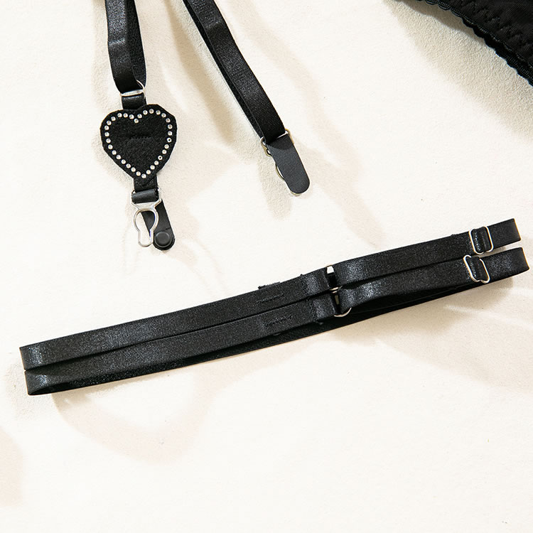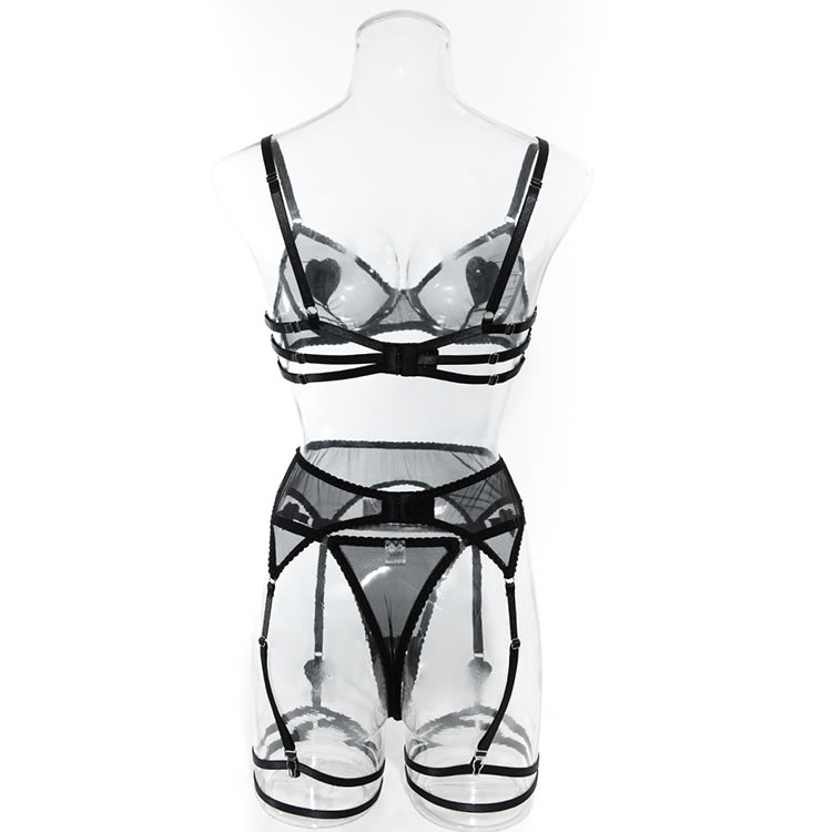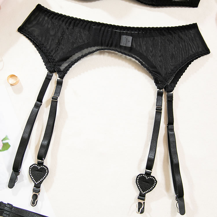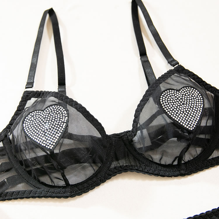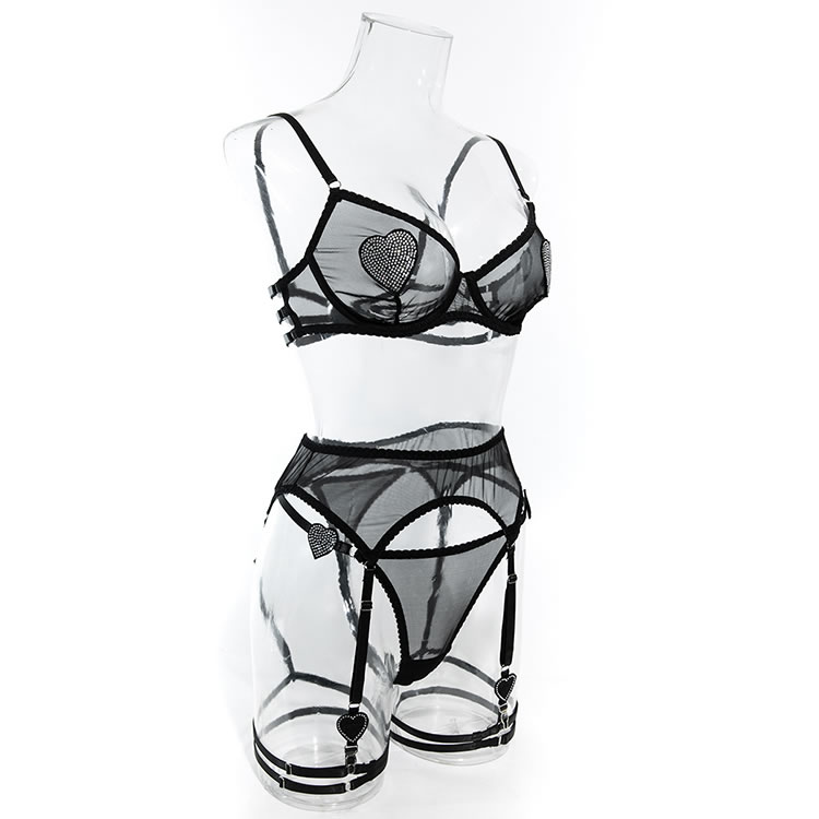 Make a bold statement with this heart-embellished lingerie set. The sheer black fabric is adorned with sparkling heart details that add a touch of glamour and romance. The bra features intricate mesh trim and supportive design, while the matching garter belt and panties offer both style and comfort. Perfect for those who want to feel confident and alluring.