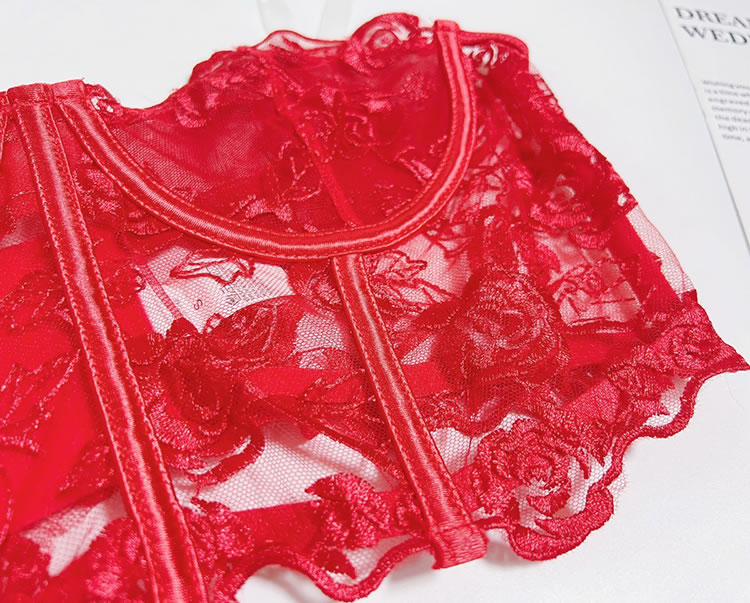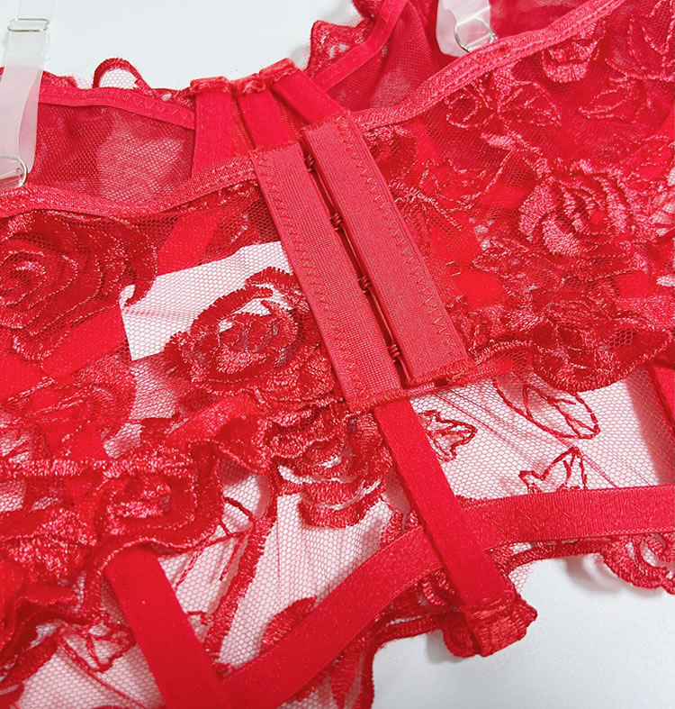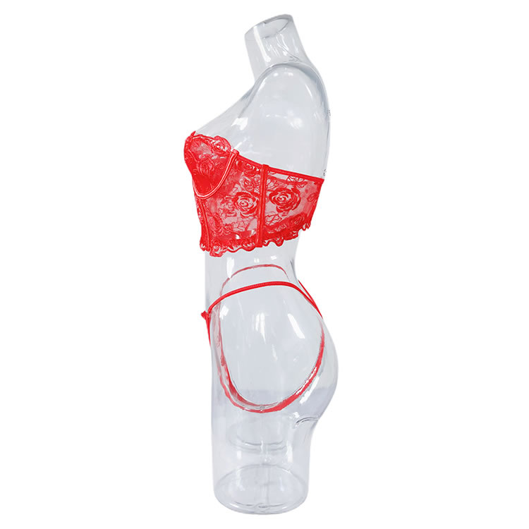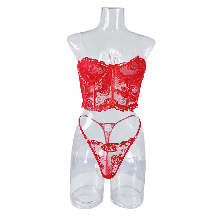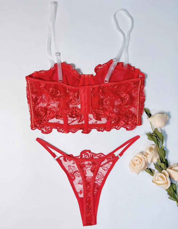 Bring on the beauty in this exclusive strapless bra set featuring sheer, underwire cups with floral embroidery, a scalloped lace trim, a sheer back with a hook and eye back closure, and a matching panty with a thong cut back.