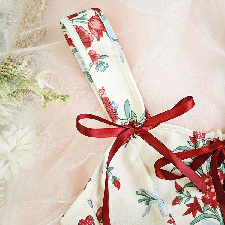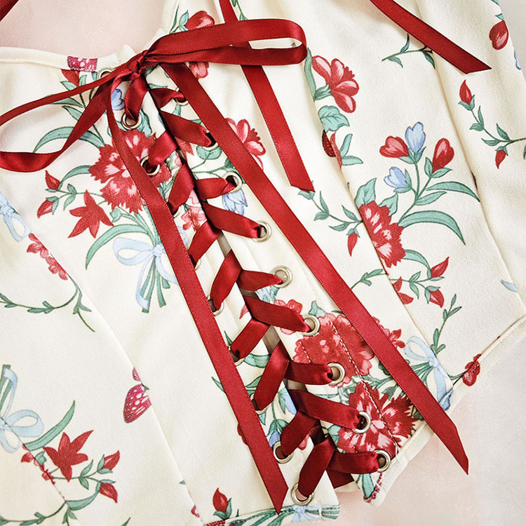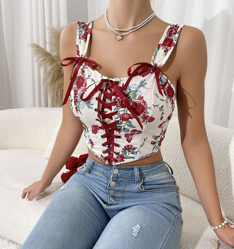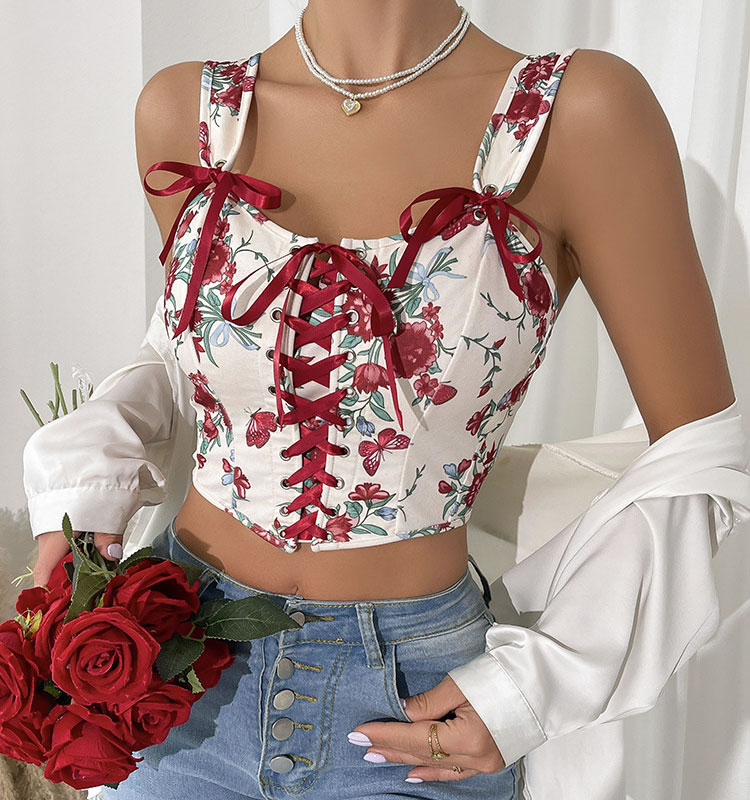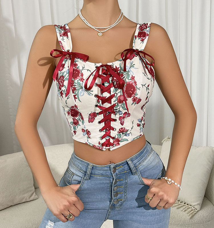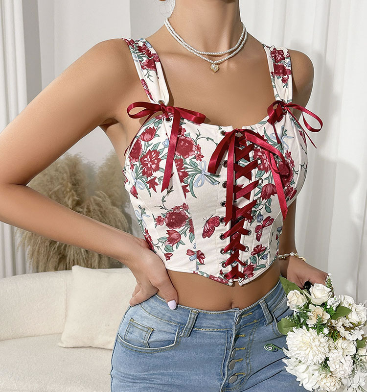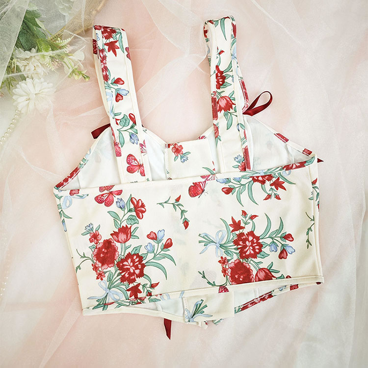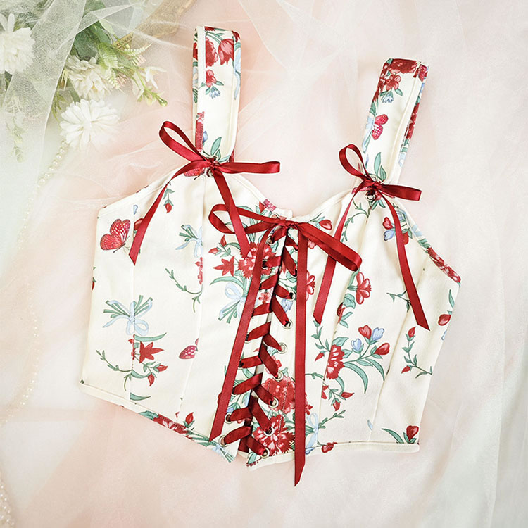 Add a touch of style to your collection with this floral bustier featuring a lace-up front. The combination of a sweetheart neckline, floral print, and red ribbon ties makes it a versatile piece that can be dressed up or down.